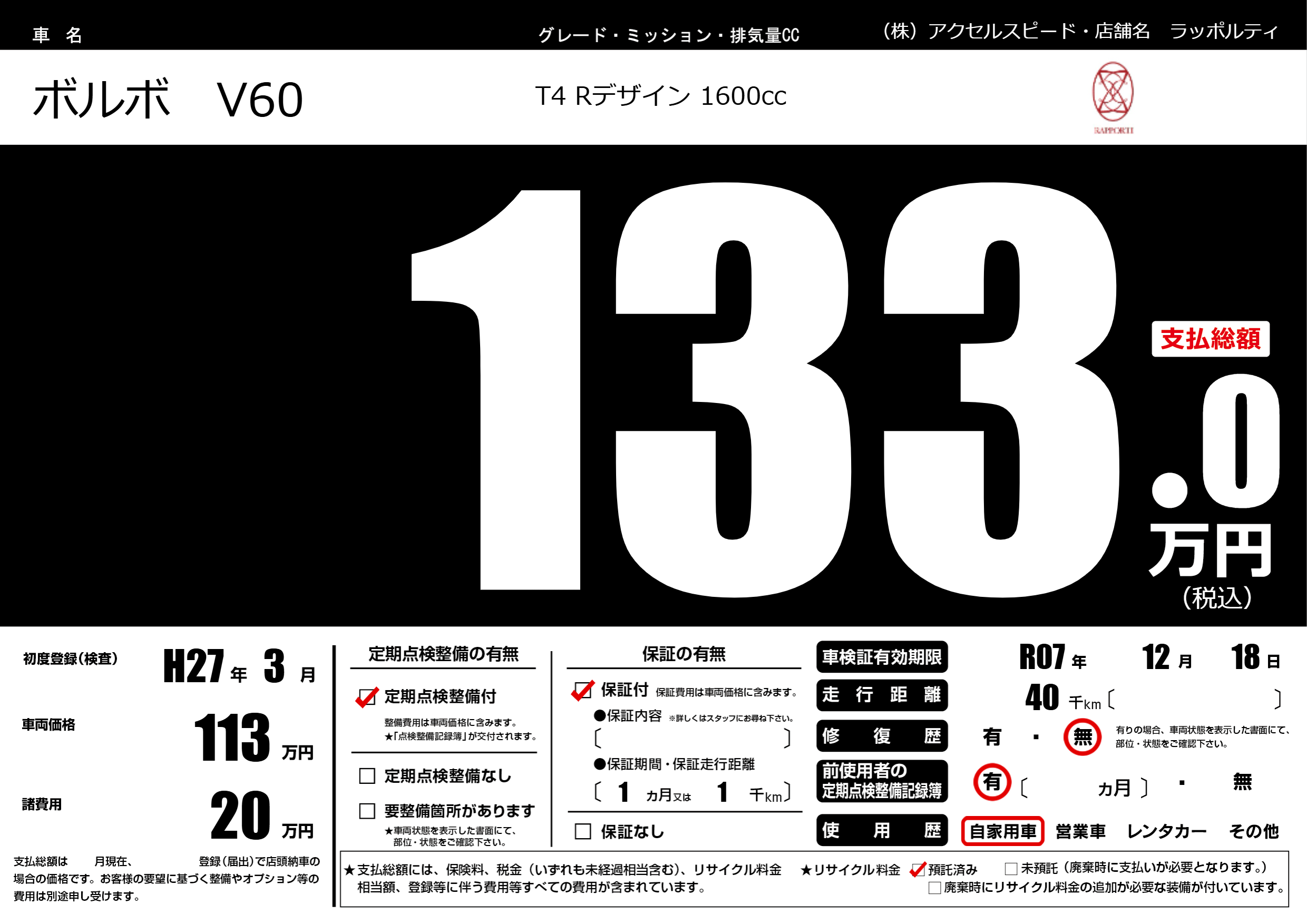 | 車名 | ボルボ V60 | グレード ミッション 排気量 |