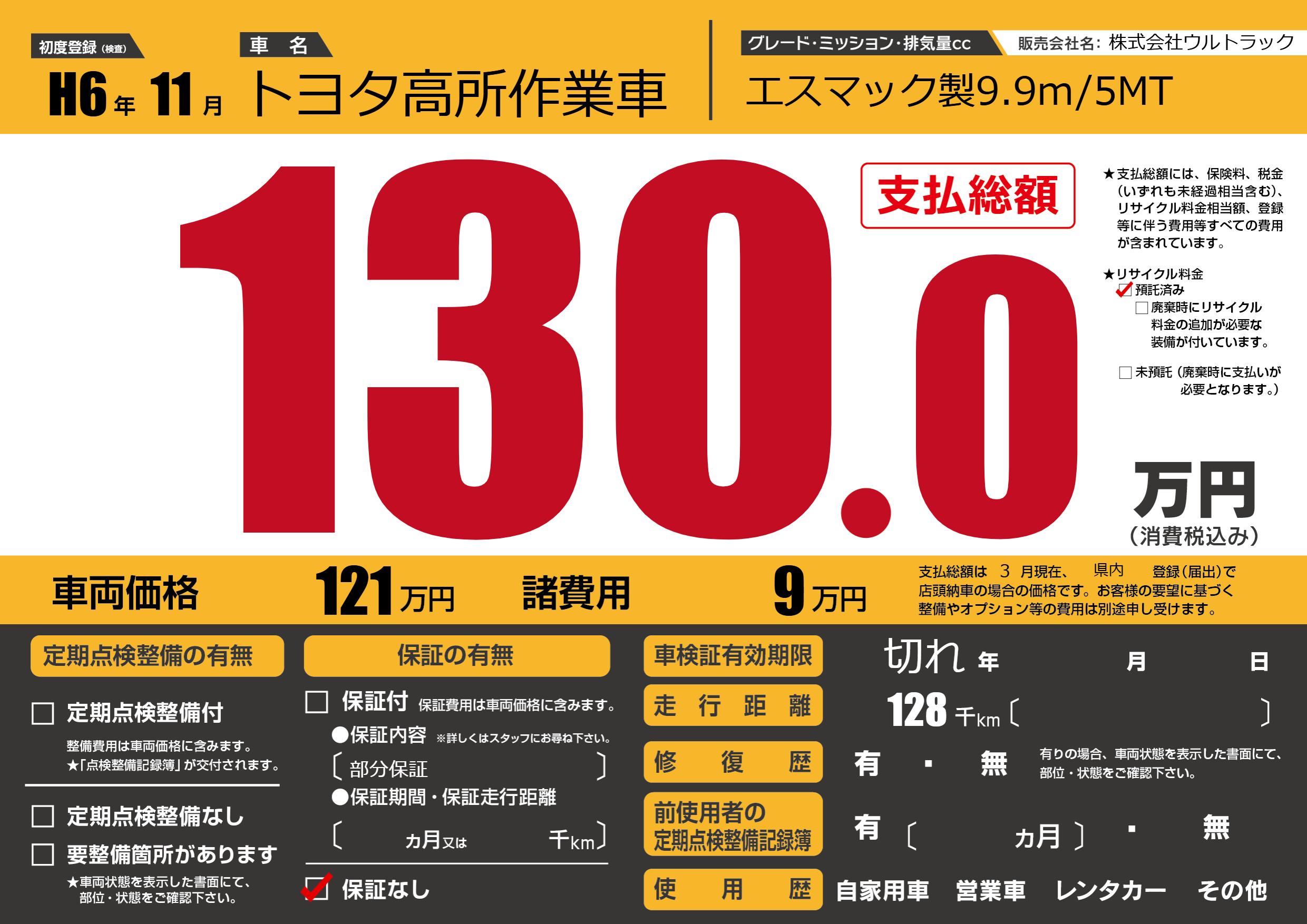 | 走行キロ | 12.8万km | 初年度登録 | H6年11月 |
