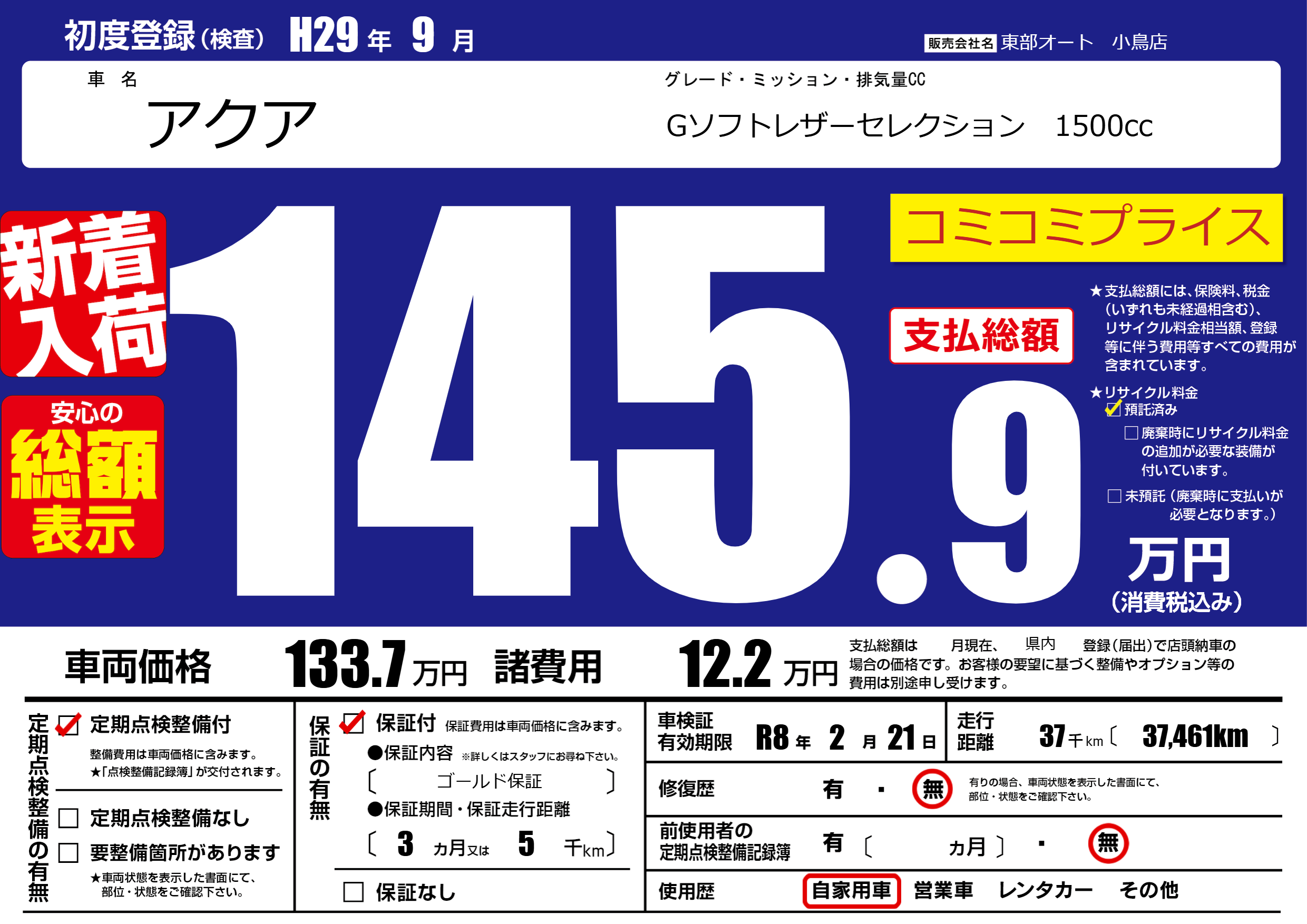 | 走行キロ | 3.7万km | 初年度登録 | H29年9月 |