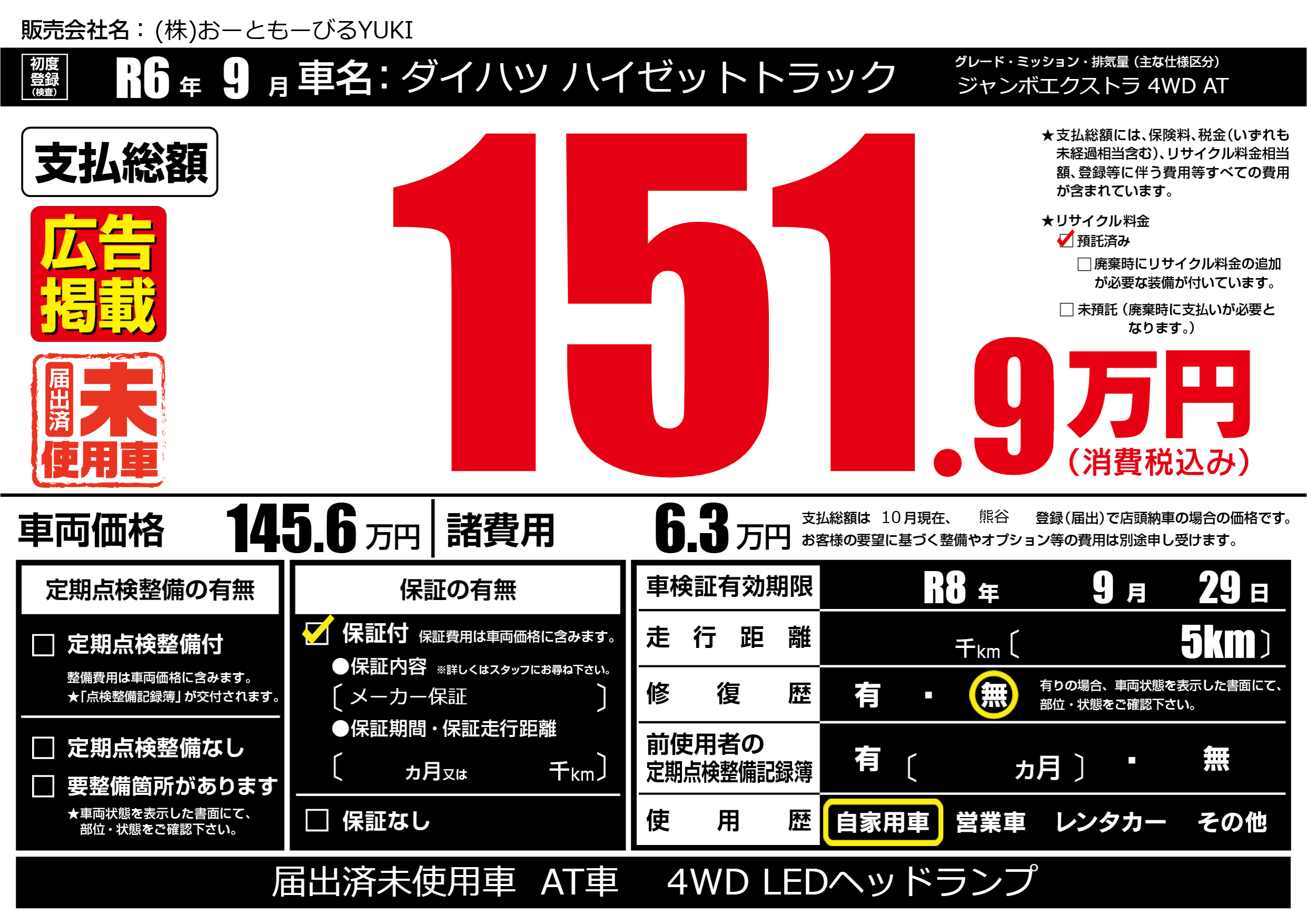 | 走行キロ | - | 初年度登録 | R6年9月 |