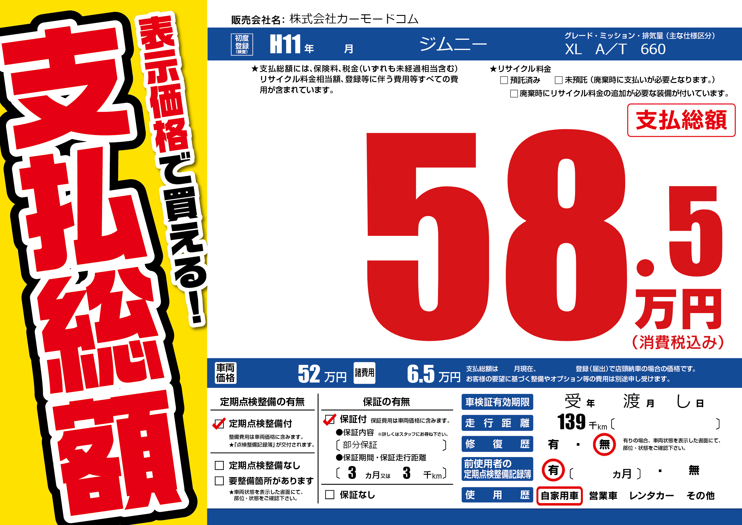 保証付き 保証内容(部分保証) 3ヶ月または(3)千kmまで |