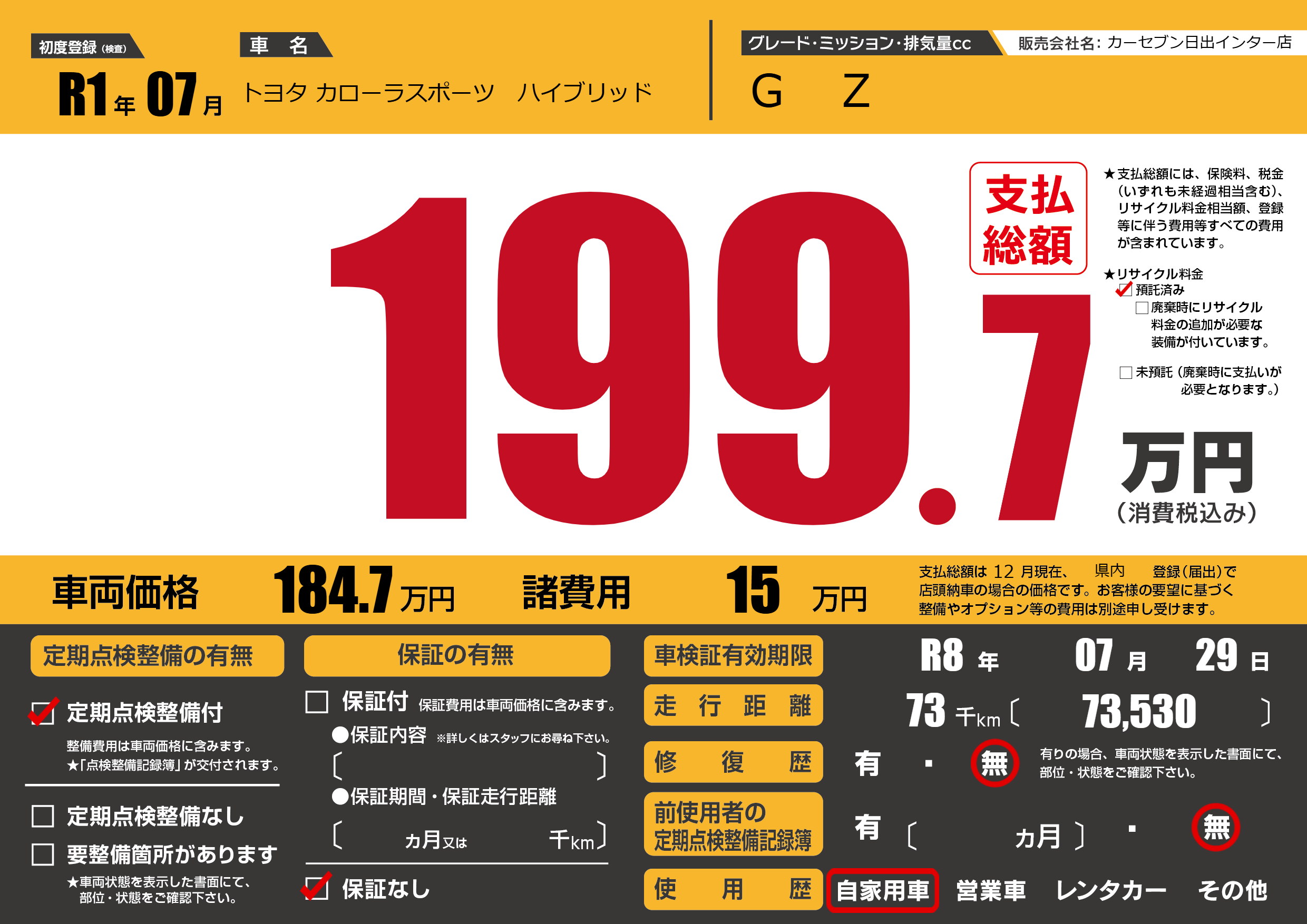 | 走行キロ | 7.3万km | 初年度登録 | R1年07月 |