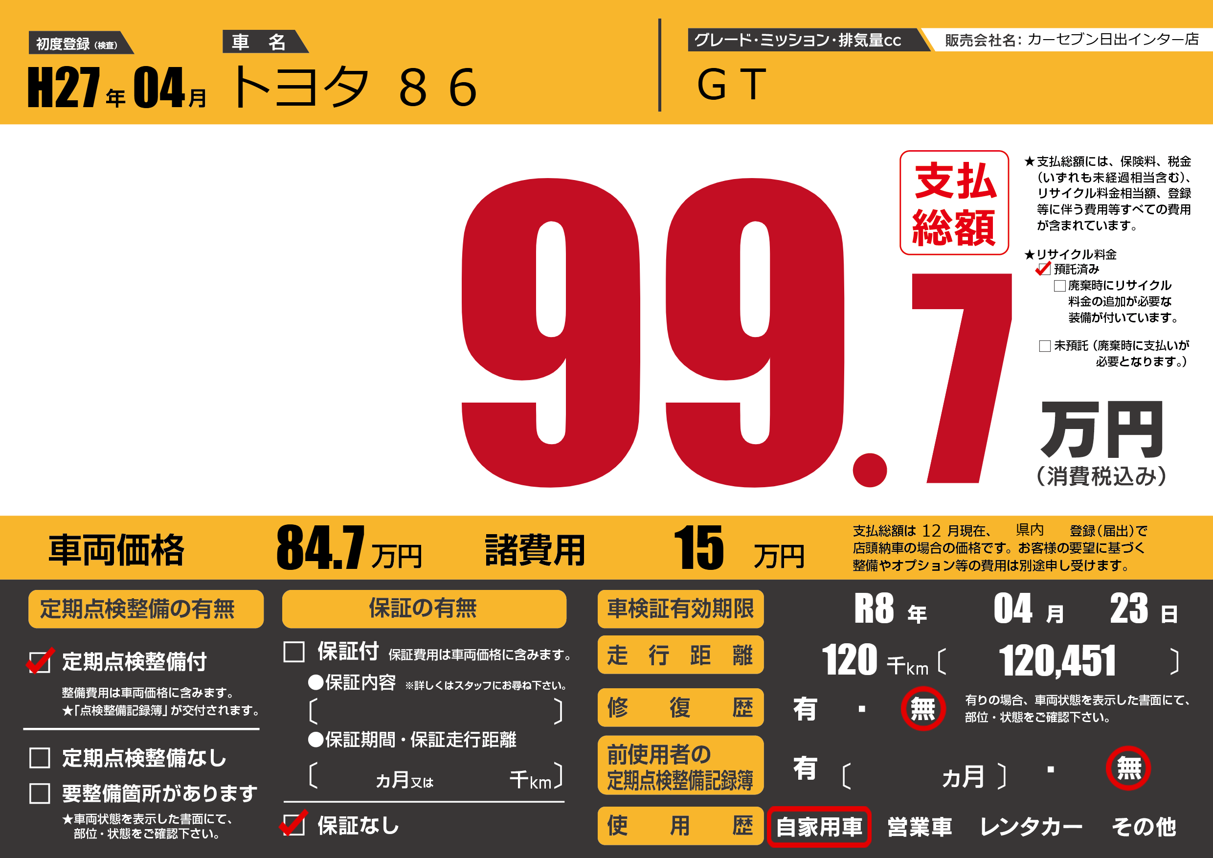 | 車名 | トヨタ 86 | グレード ミッション 排気量 |
