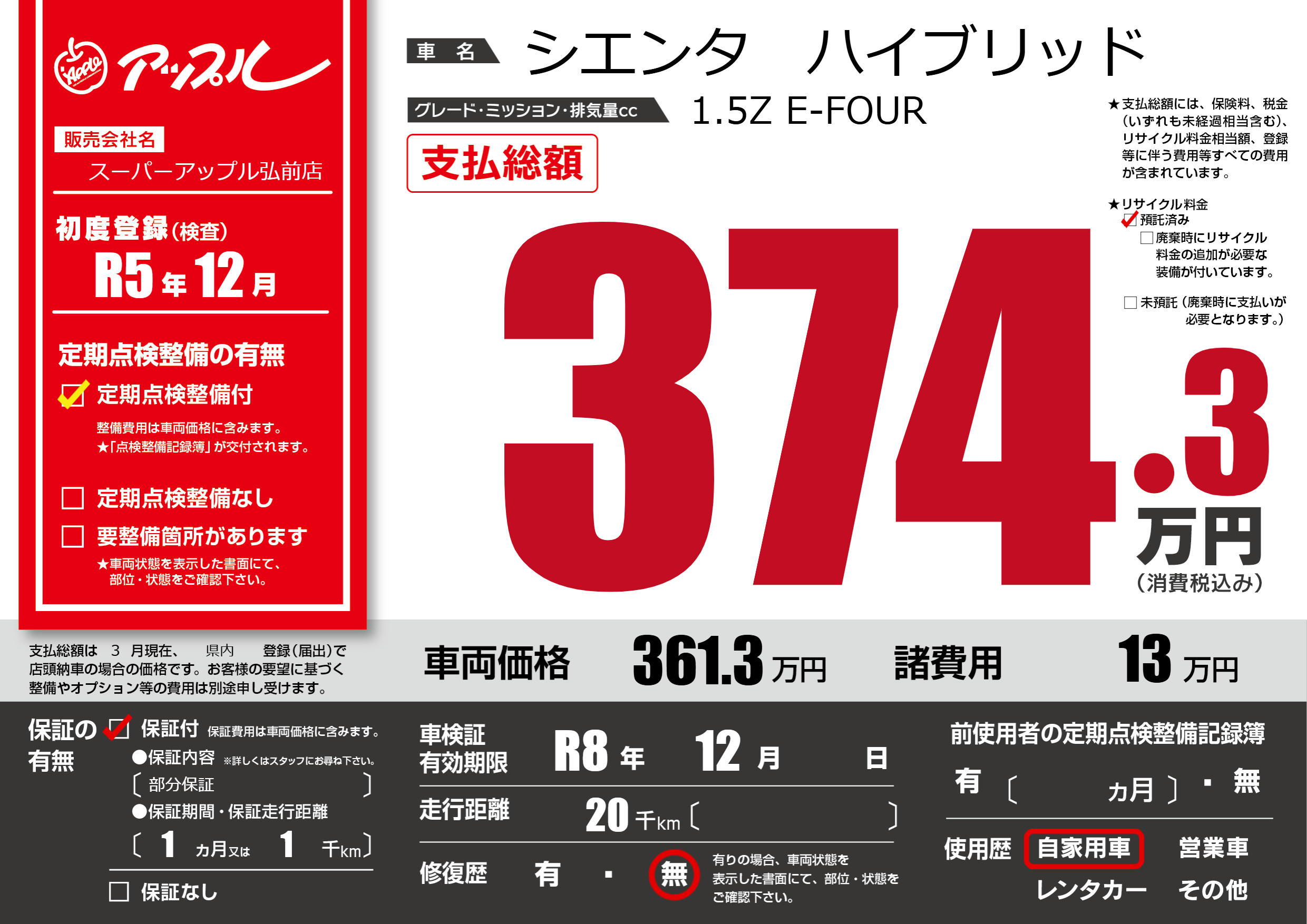 | 車名 | シエンタ ハイブリッド | グレード ミッション 排気量 |