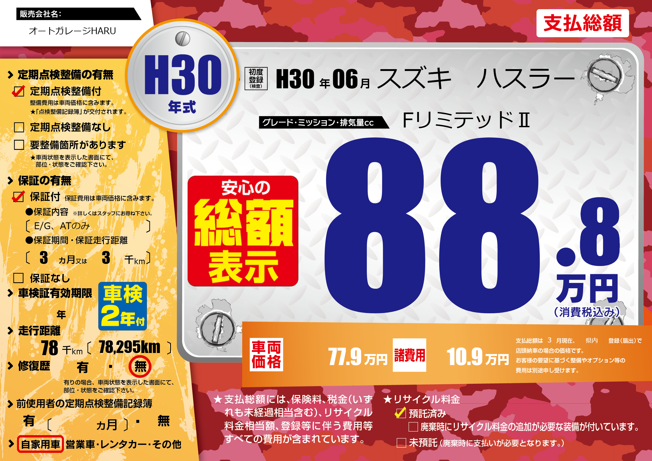| 車名 | スズキ ハスラー | グレード ミッション 排気量 |