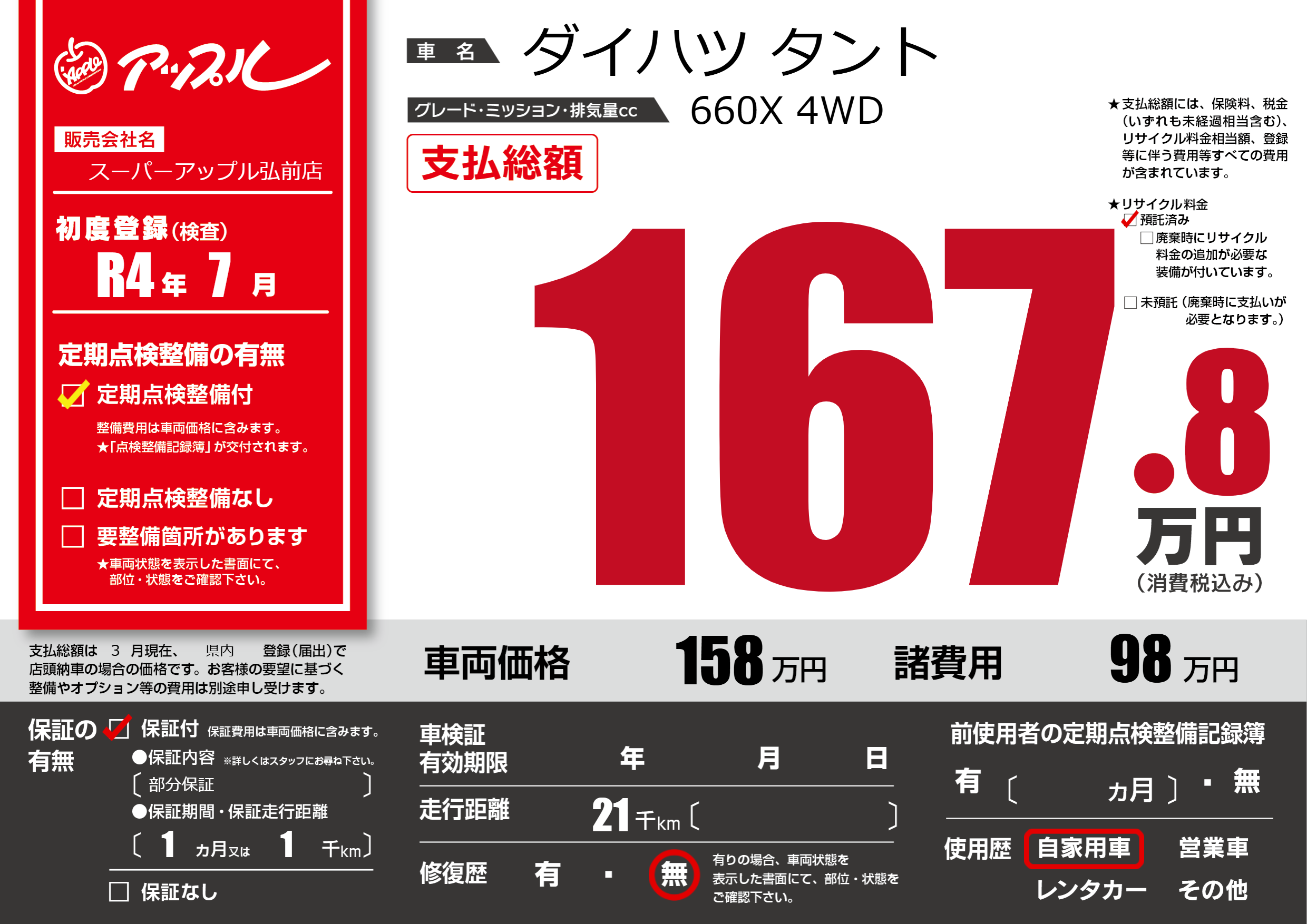 | 車名 | ダイハツ タント | グレード ミッション 排気量 |