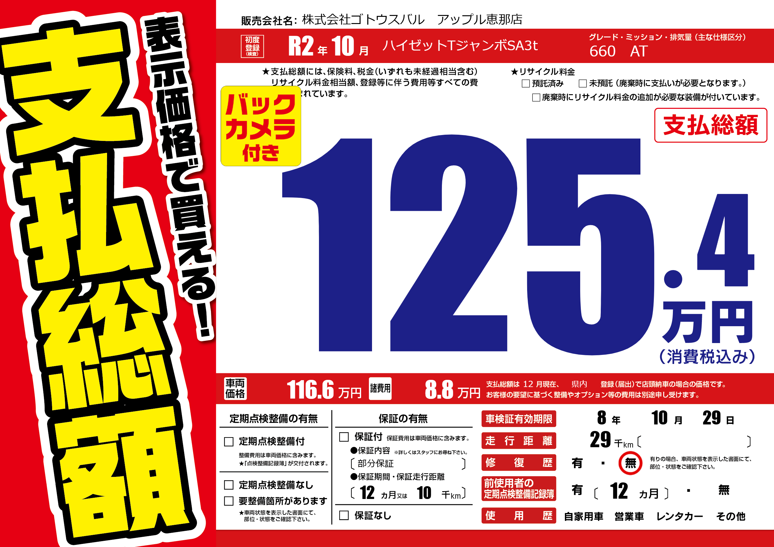 保証なし 保証内容(部分保証) 12ヶ月または(10)千kmまで |