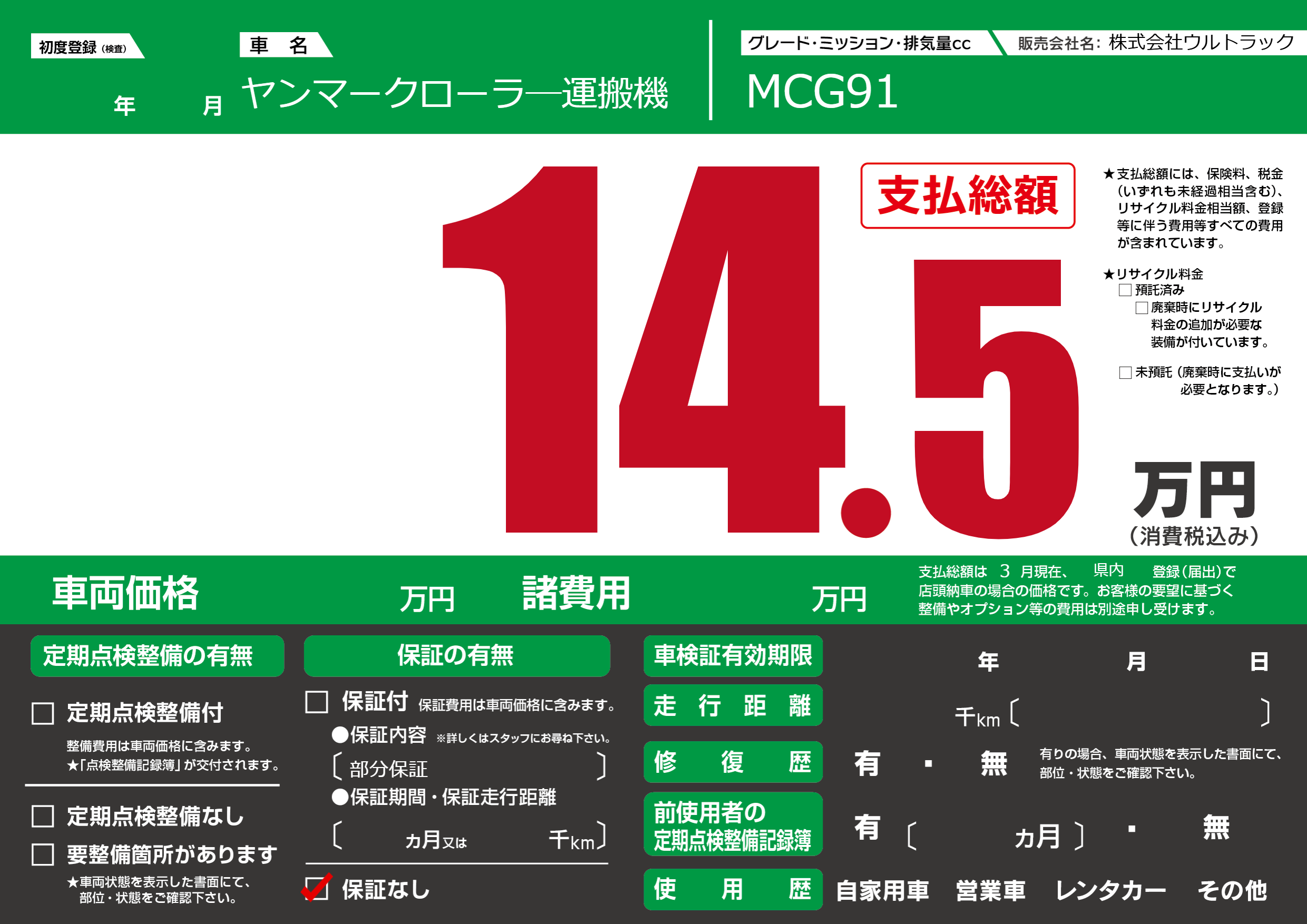 保証なし 保証内容(部分保証) ---ヶ月または()千kmまで |