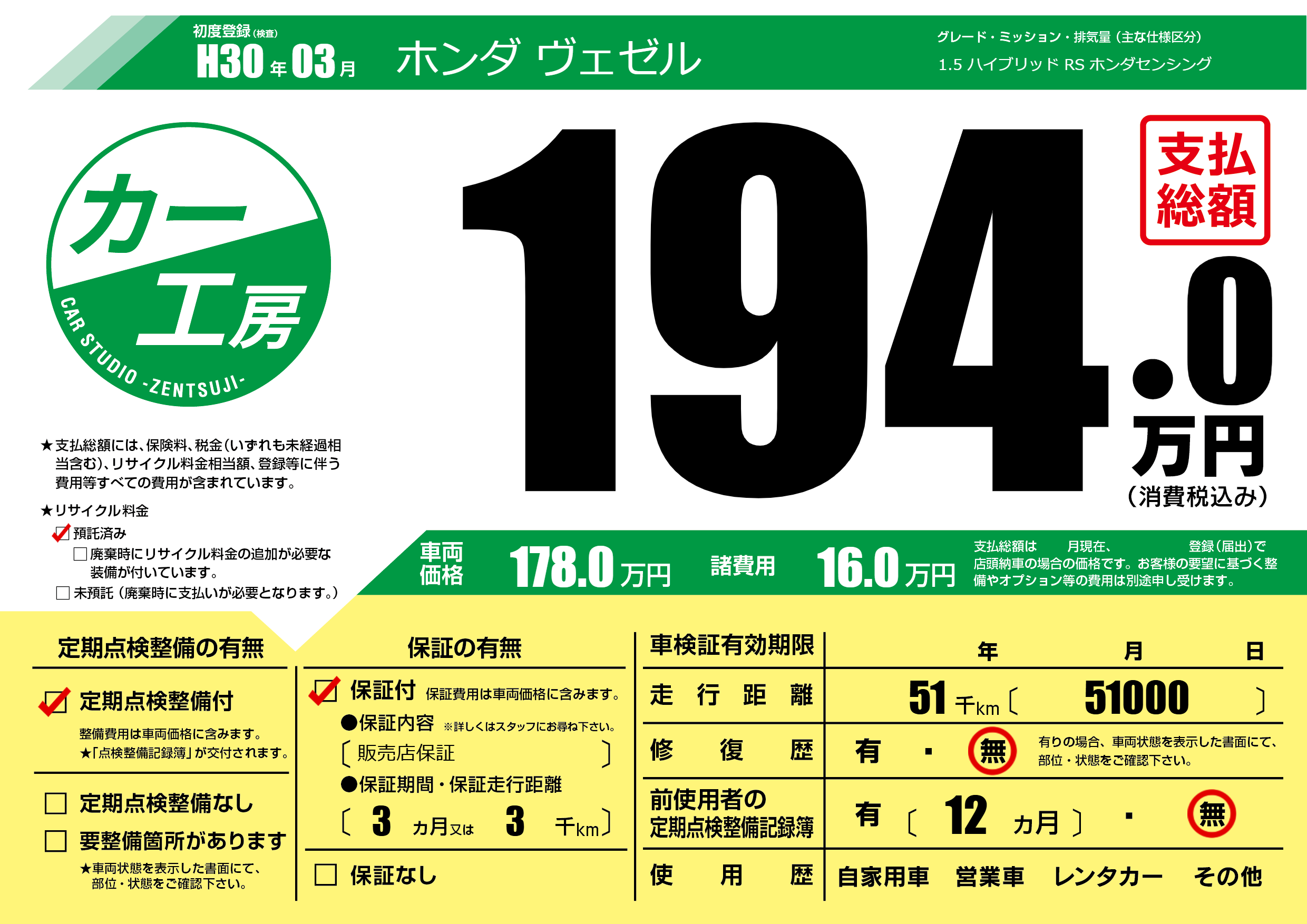 | 走行キロ | 5.1万km | 初年度登録 | H30年03月 |