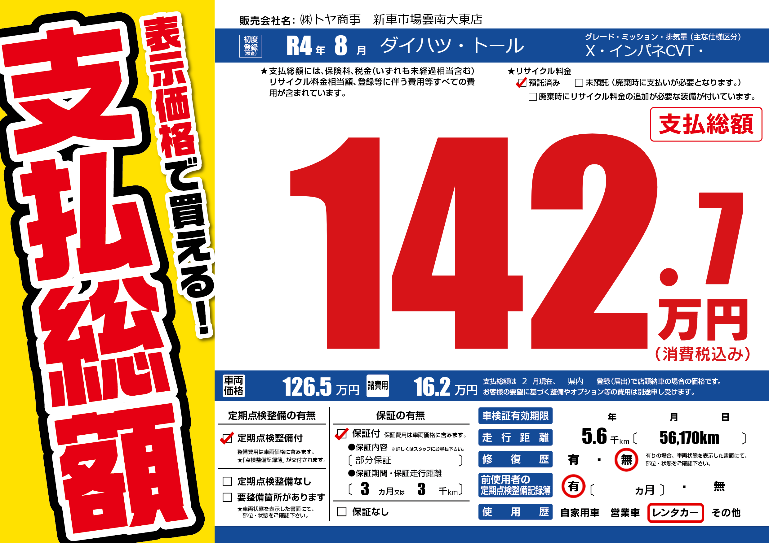| 車名 | ダイハツ・トール | グレード ミッション 排気量 |