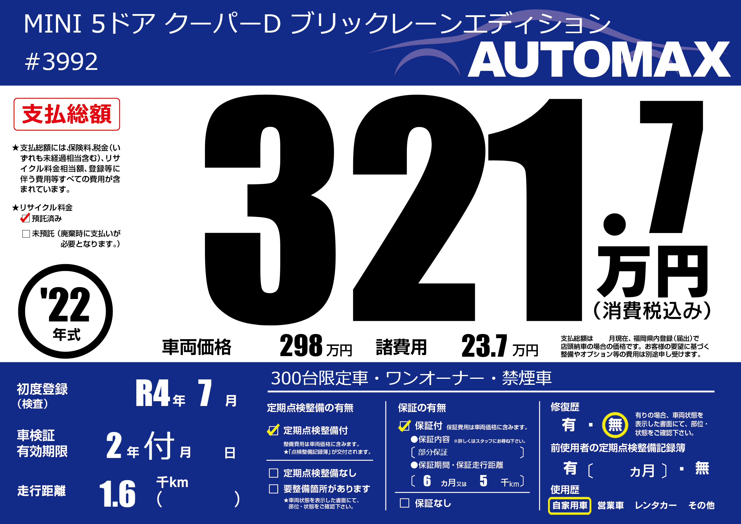 | 車名 | MINI 5ドア クーパーD ブリックレーンエディション | グレード ミッション 排気量 |