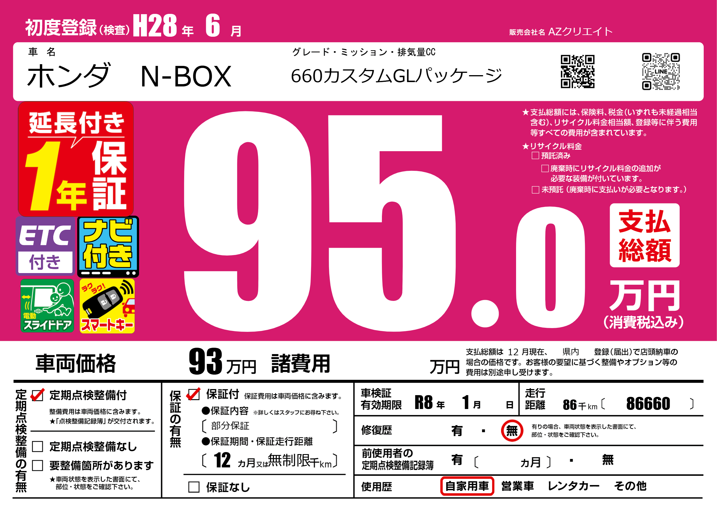 | 走行キロ | 8.6万km | 初年度登録 | H28年6月 |