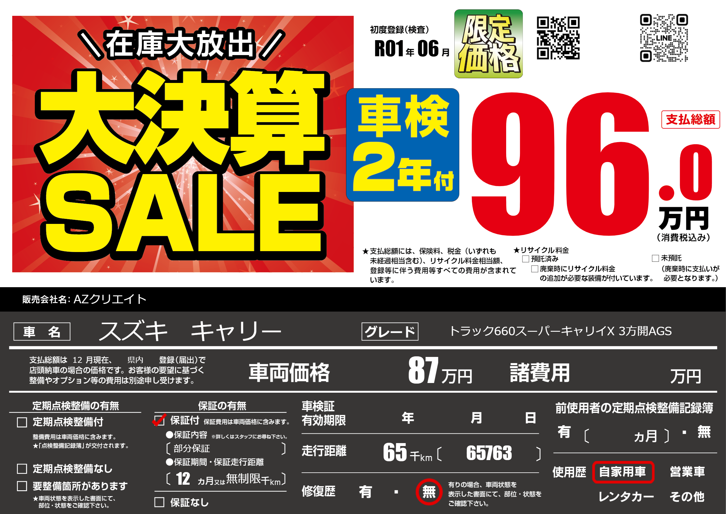 | 車名 | スズキ キャリー | グレード ミッション 排気量 |