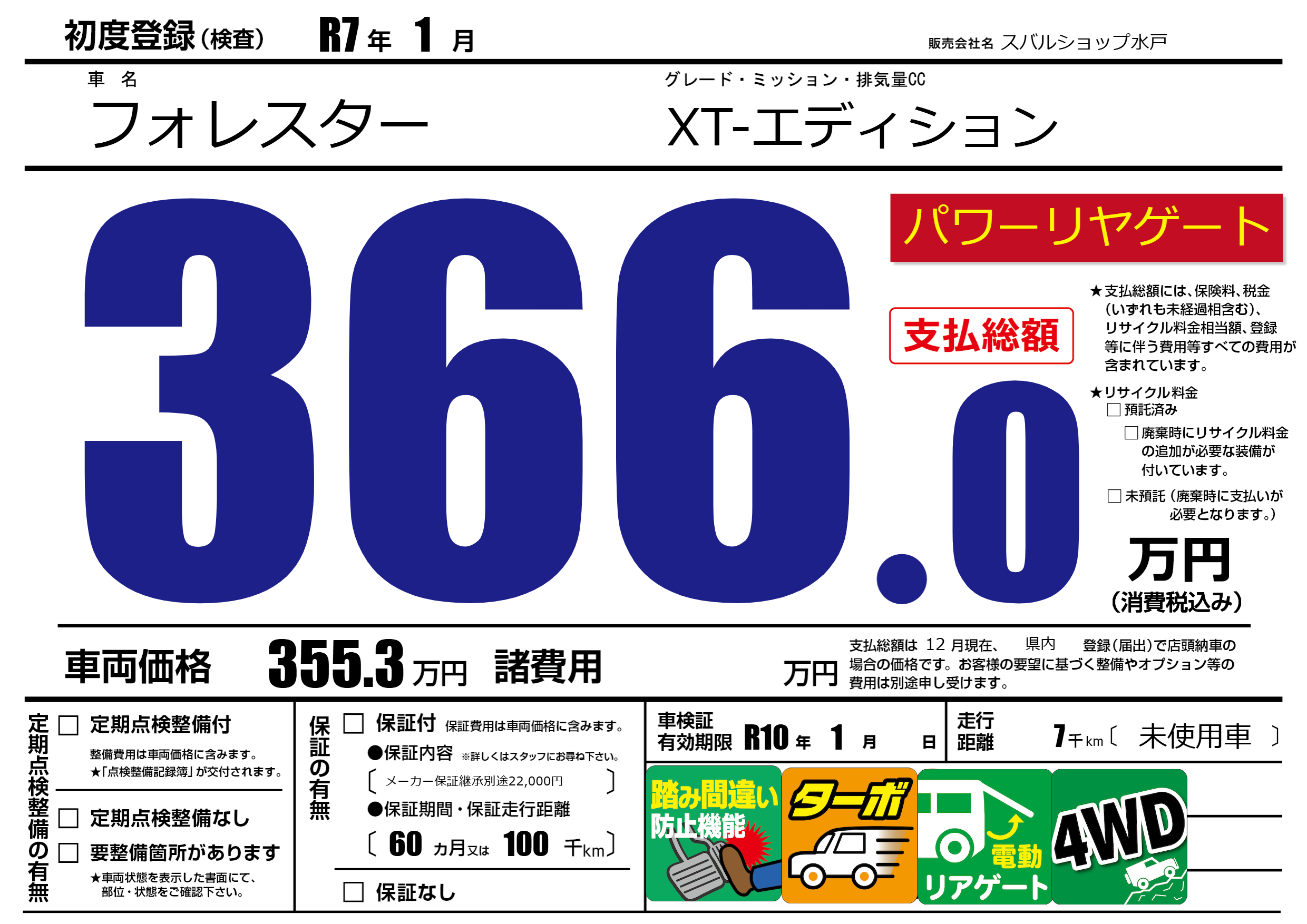 | 車名 | フォレスター | グレード ミッション 排気量 |