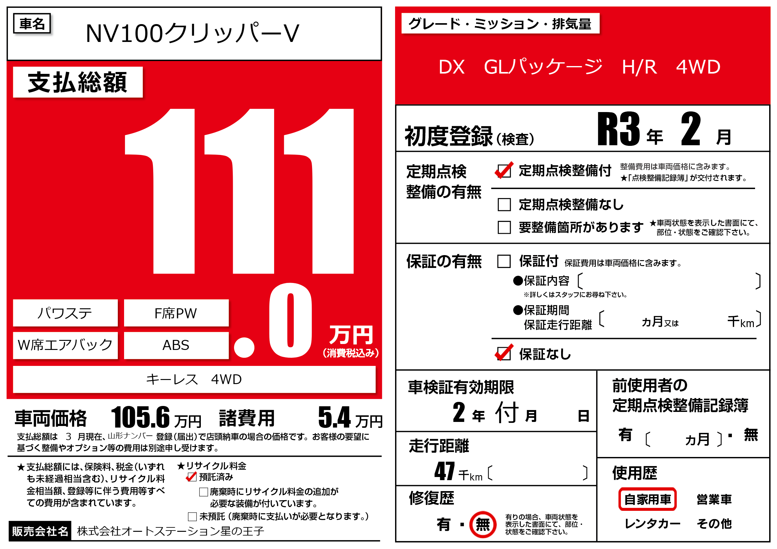| 車名 | NV100クリッパーV | グレード ミッション 排気量 |