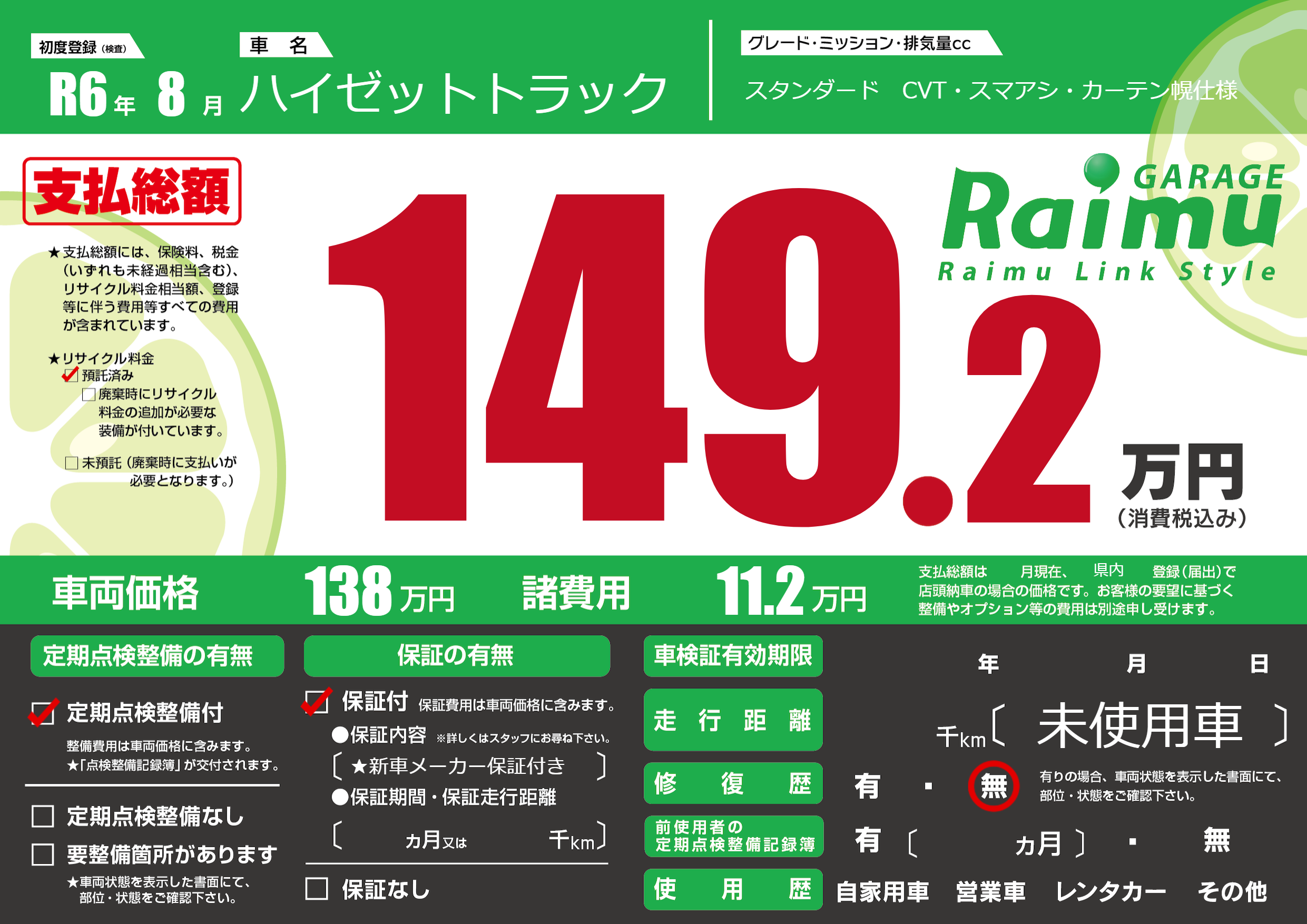 保証付き 保証内容(★新車メーカー保証付き) ---ヶ月または()千kmまで |