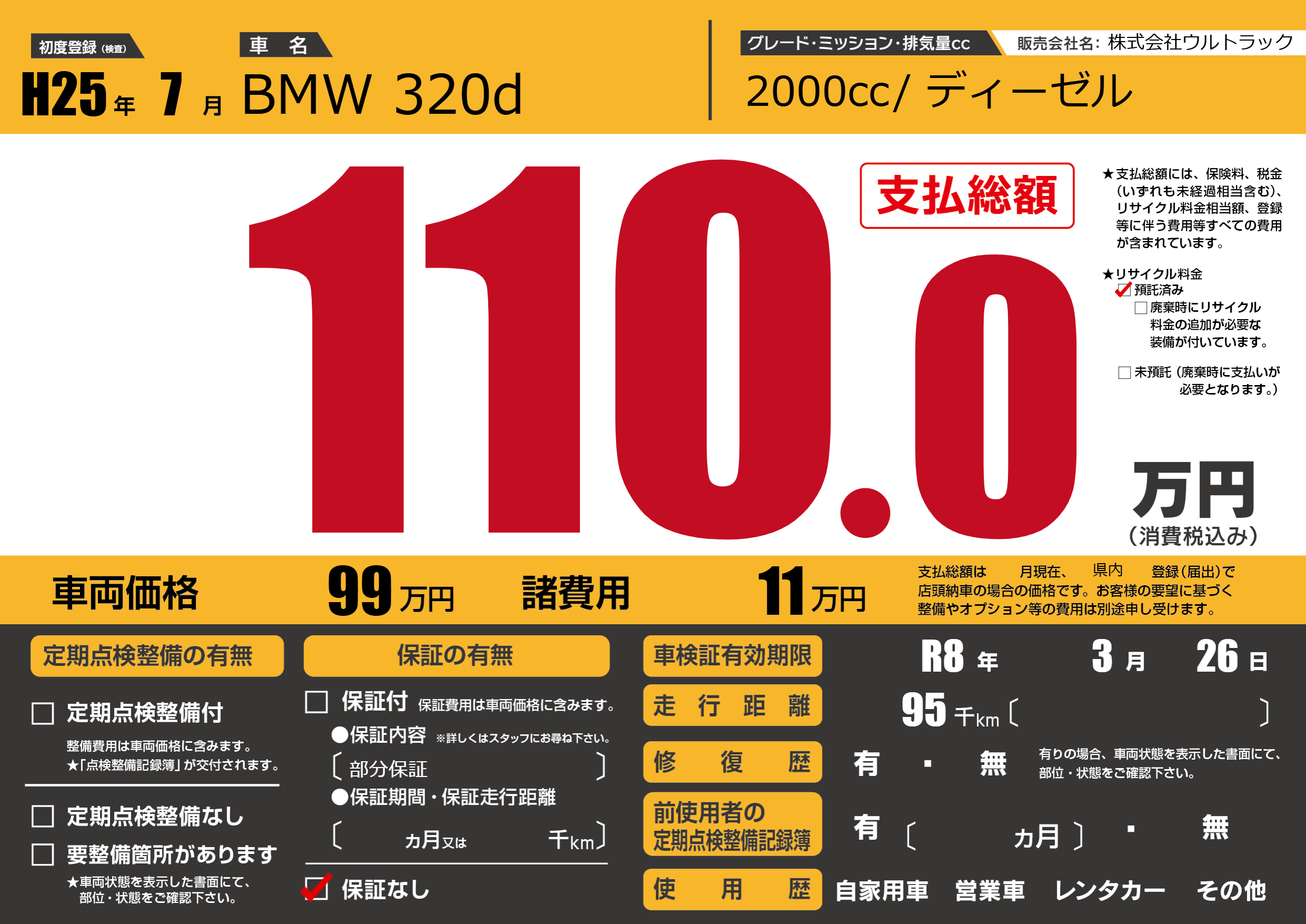 | 車名 | BMW 320d | グレード ミッション 排気量 |
