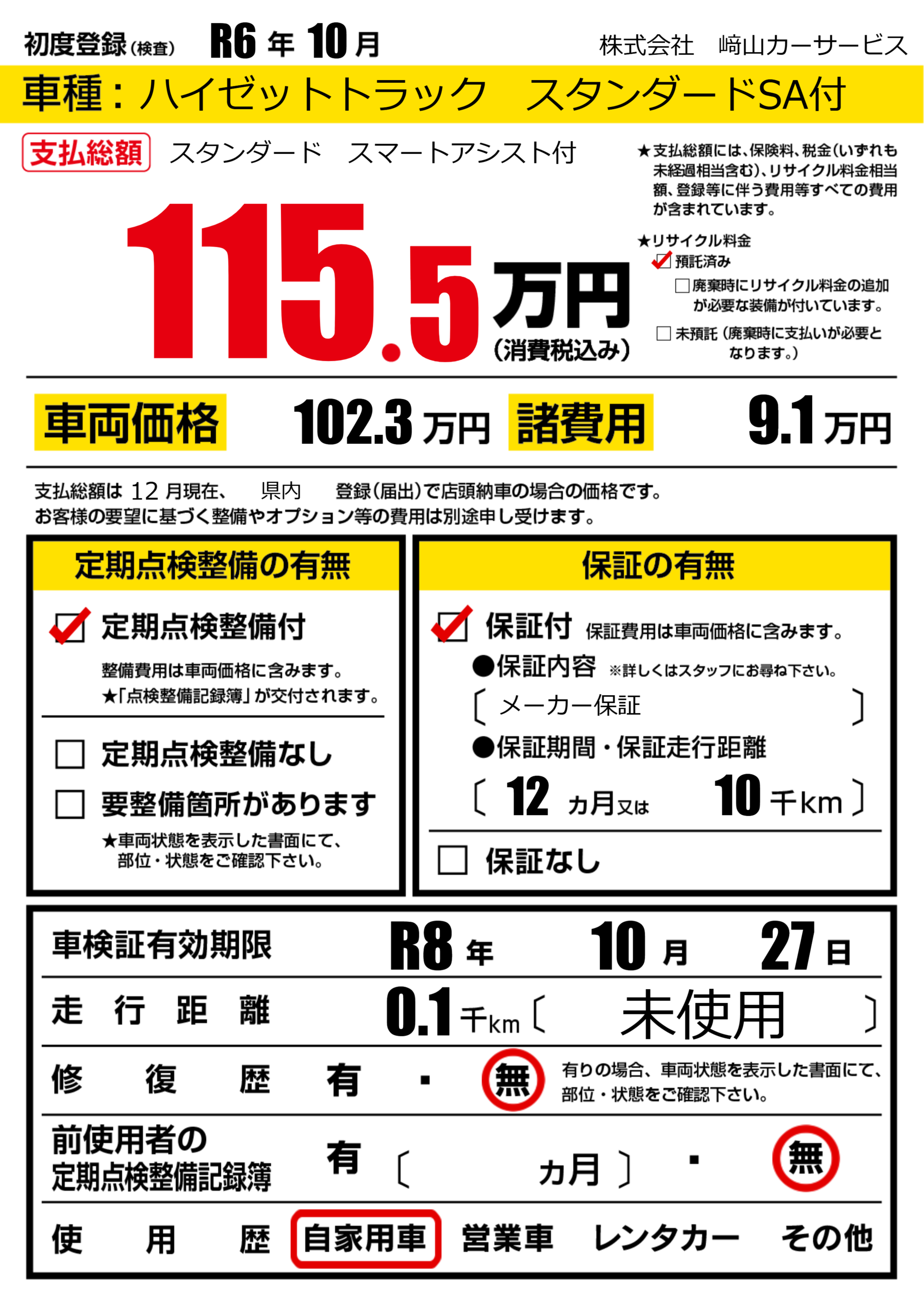 | 車名 | ハイゼットトラック スタンダードSA付 | グレード ミッション 排気量 |