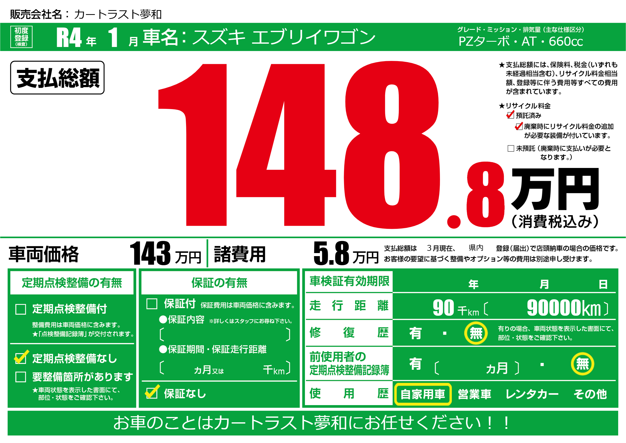 | 車名 | スズキ エブリイワゴン | グレード ミッション 排気量 |