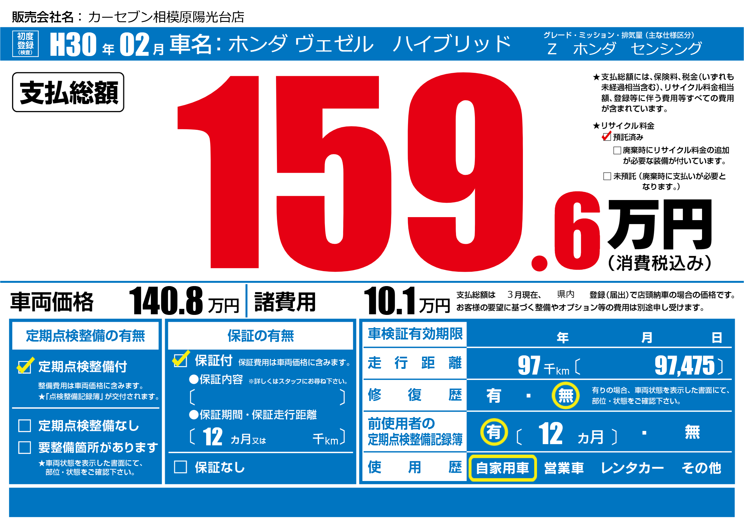 | 車名 | ホンダ ヴェゼル ハイブリッド | グレード ミッション 排気量 |