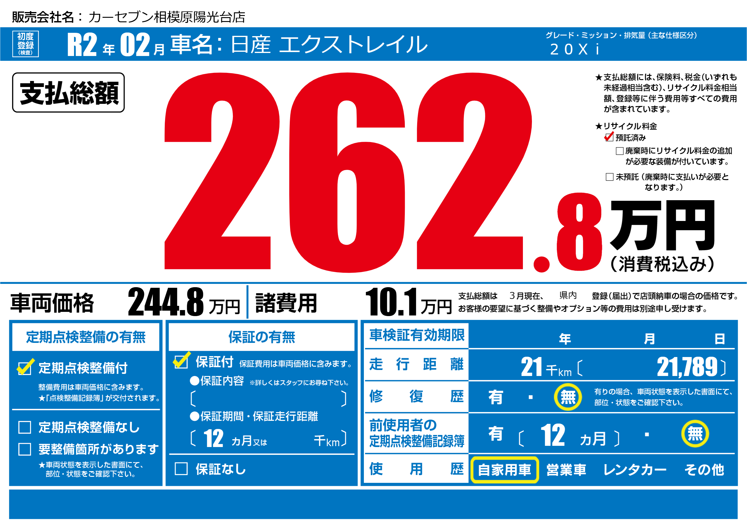 | 車名 | 日産 エクストレイル | グレード ミッション 排気量 |