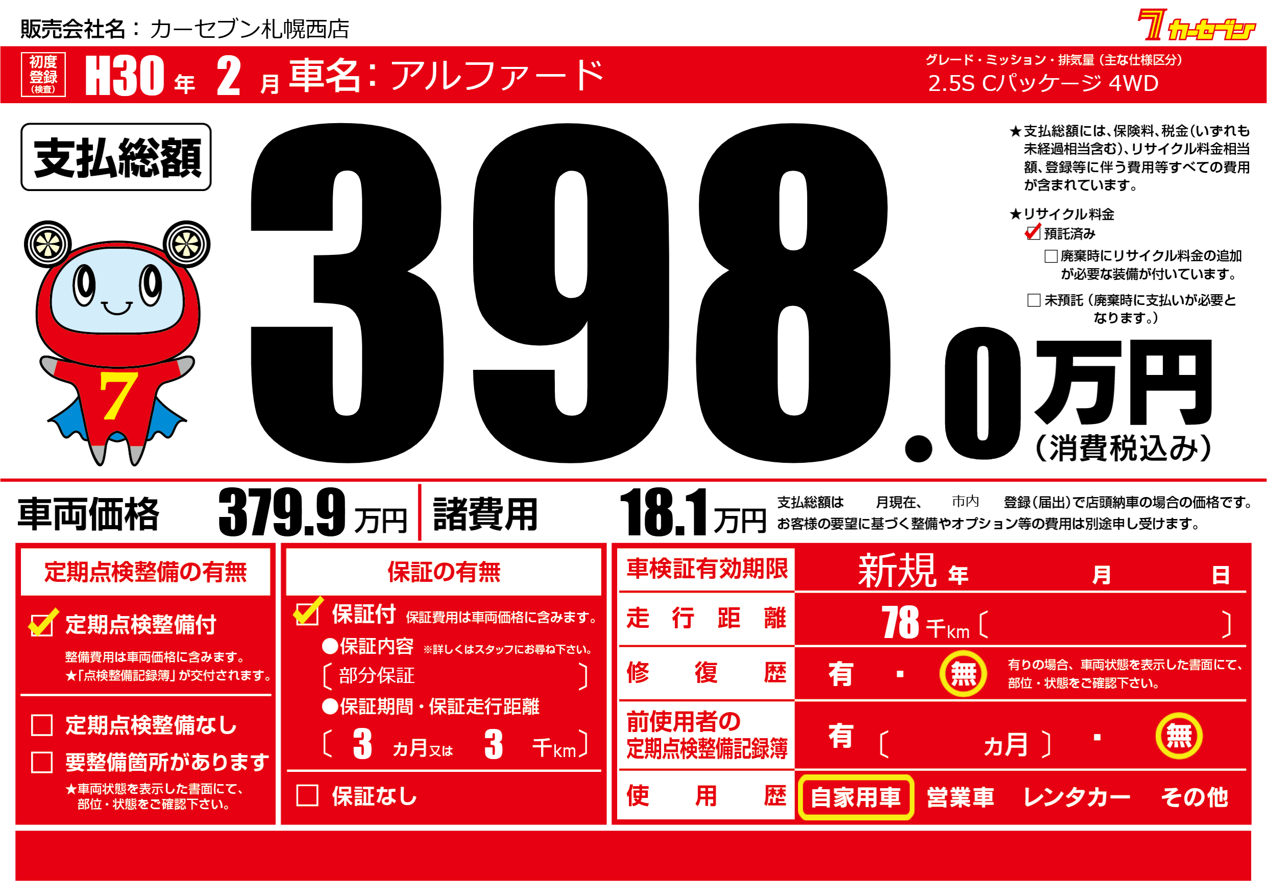 | 走行キロ | 7.8万km | 初年度登録 | H30年2月 |