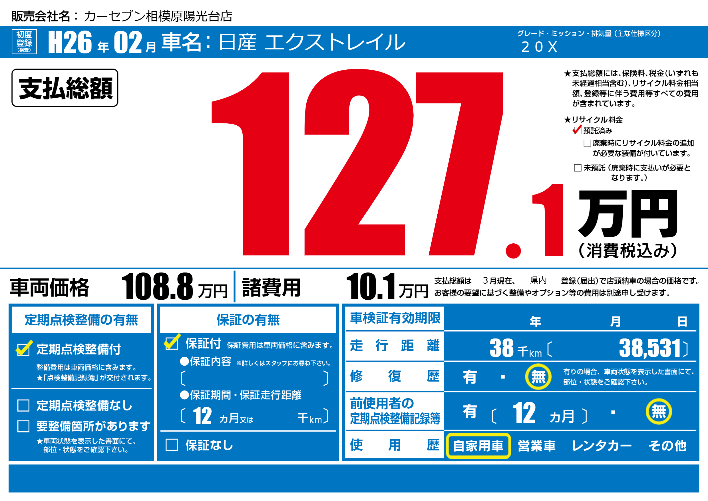 | 車名 | 日産 エクストレイル | グレード ミッション 排気量 |