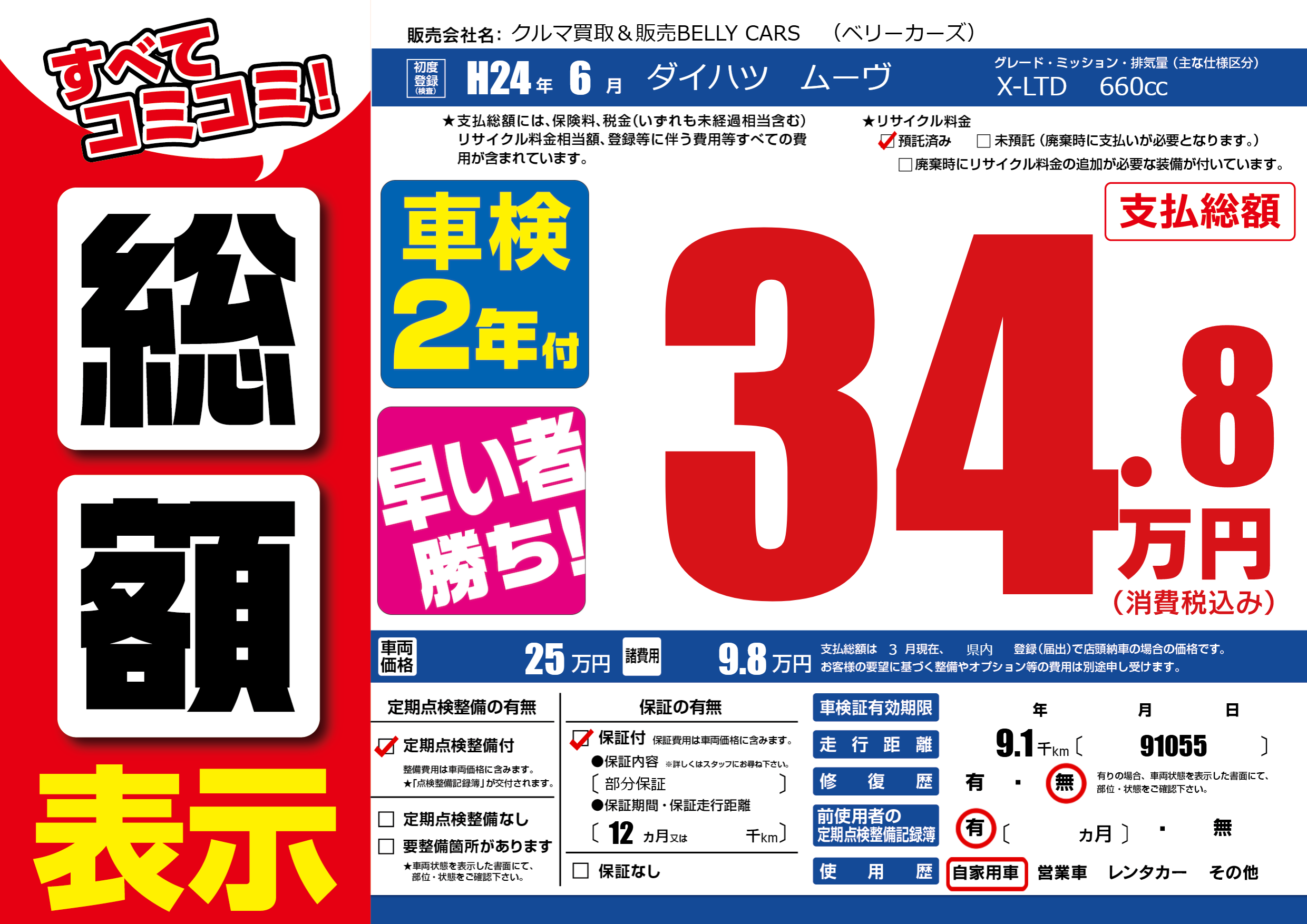 | 走行キロ | 0.9万km | 初年度登録 | H24年6月 |