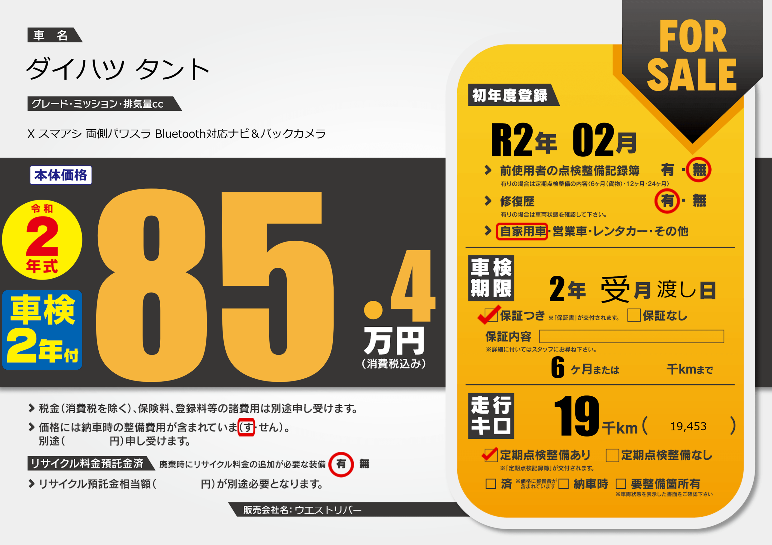 | 車名 | ダイハツ タント | グレード ミッション 排気量 |
