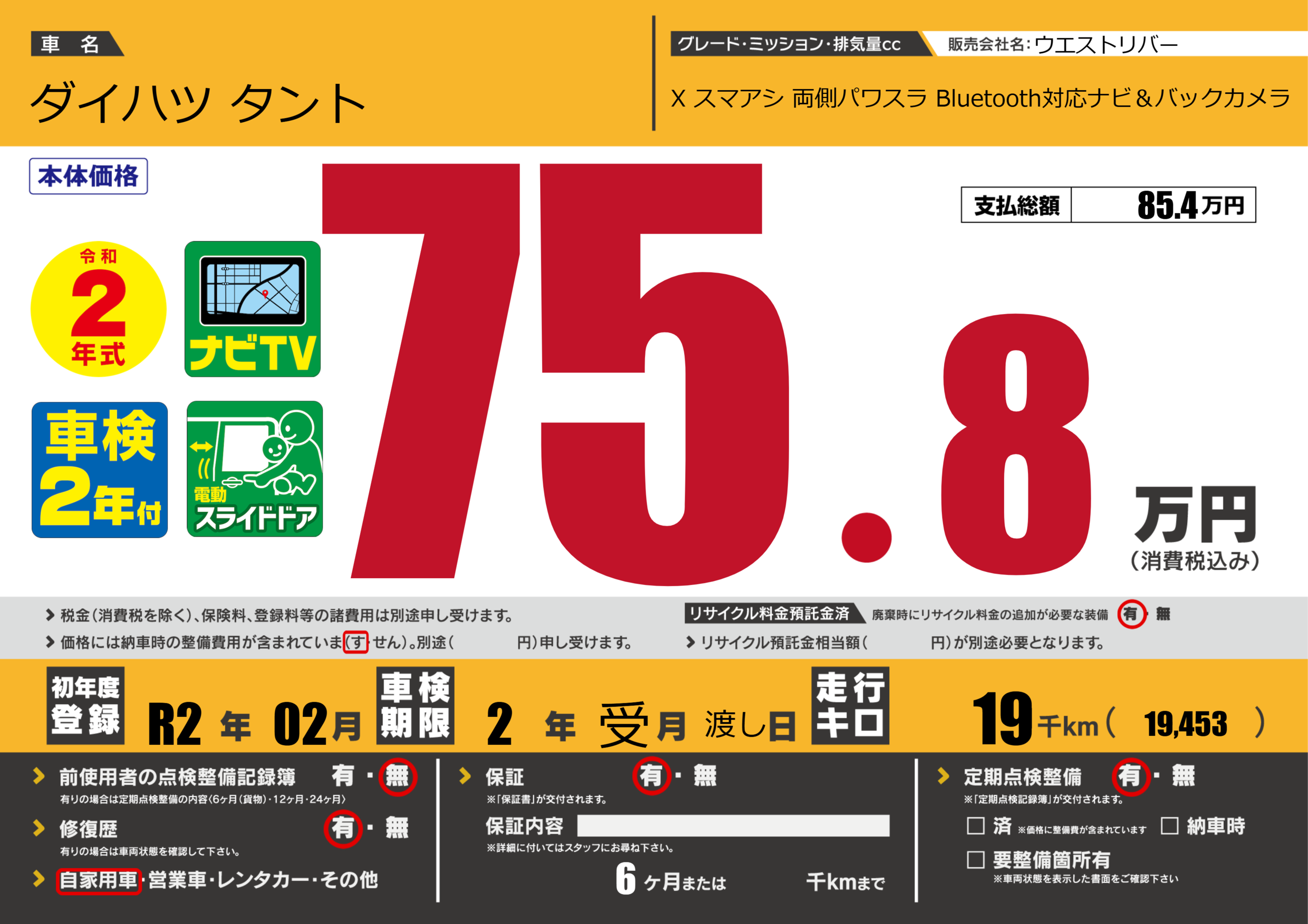 | 車名 | ダイハツ タント | グレード ミッション 排気量 |
