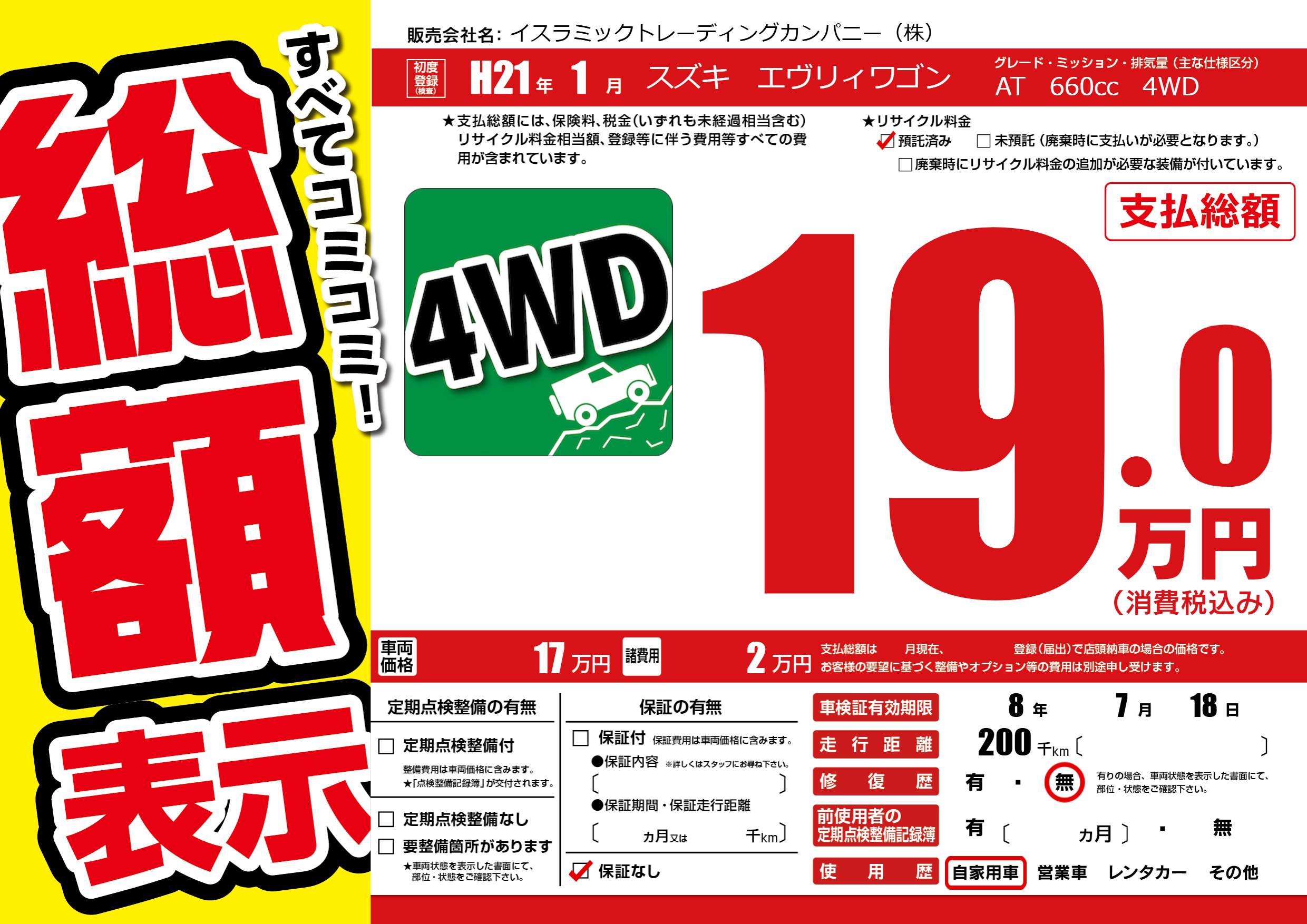 | 車名 | スズキ エヴリィワゴン | グレード ミッション 排気量 |