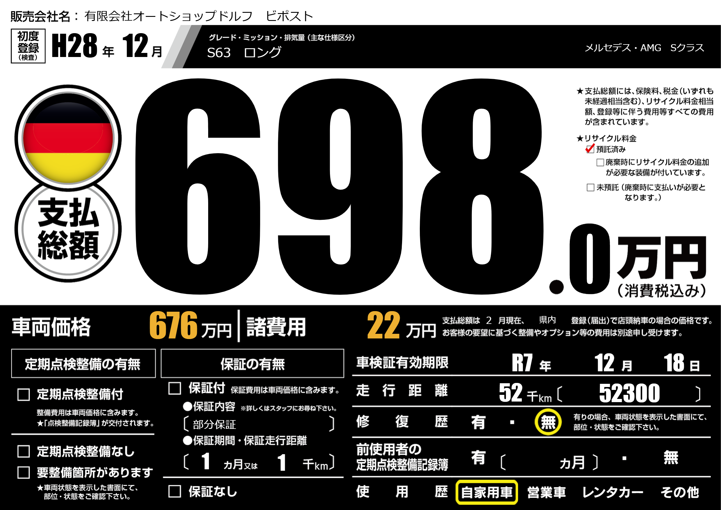 | 車名 | メルセデス・AMG Sクラス | グレード ミッション 排気量 |