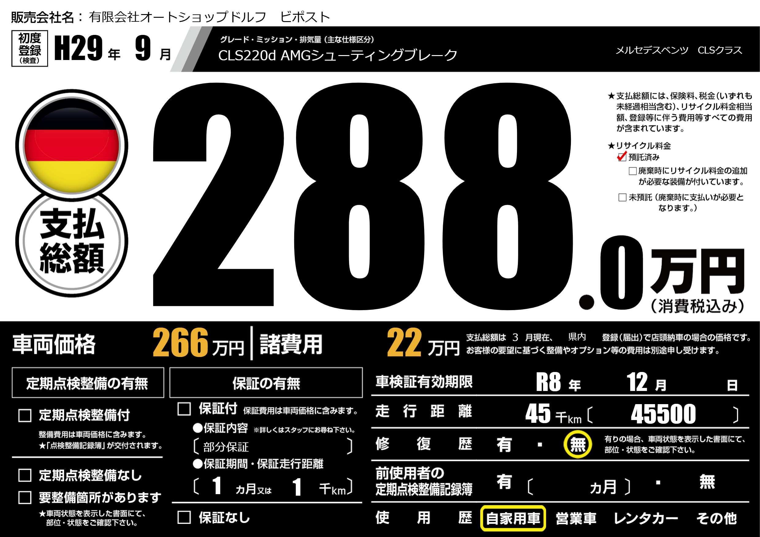 | 車名 | メルセデスベンツ CLSクラス | グレード ミッション 排気量 |