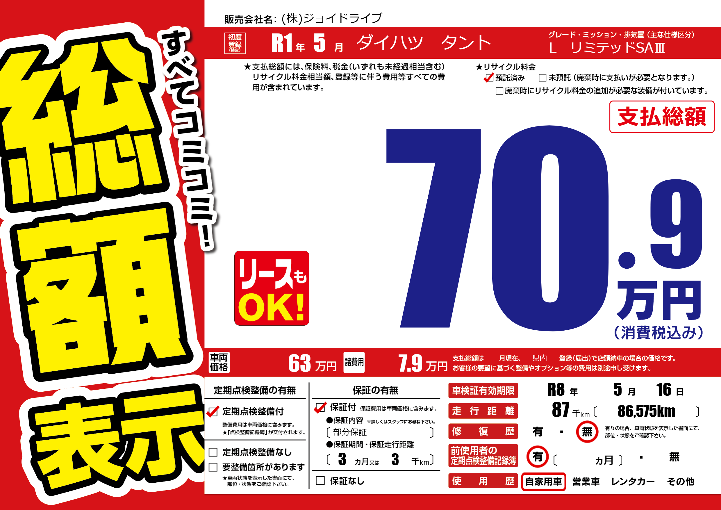 | 車名 | ダイハツ タント | グレード ミッション 排気量 |