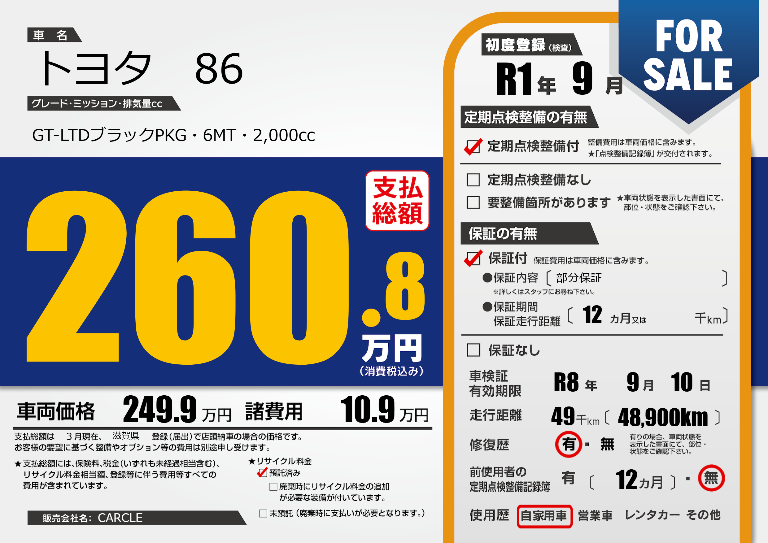 | 車名 | トヨタ 86 | グレード ミッション 排気量 |