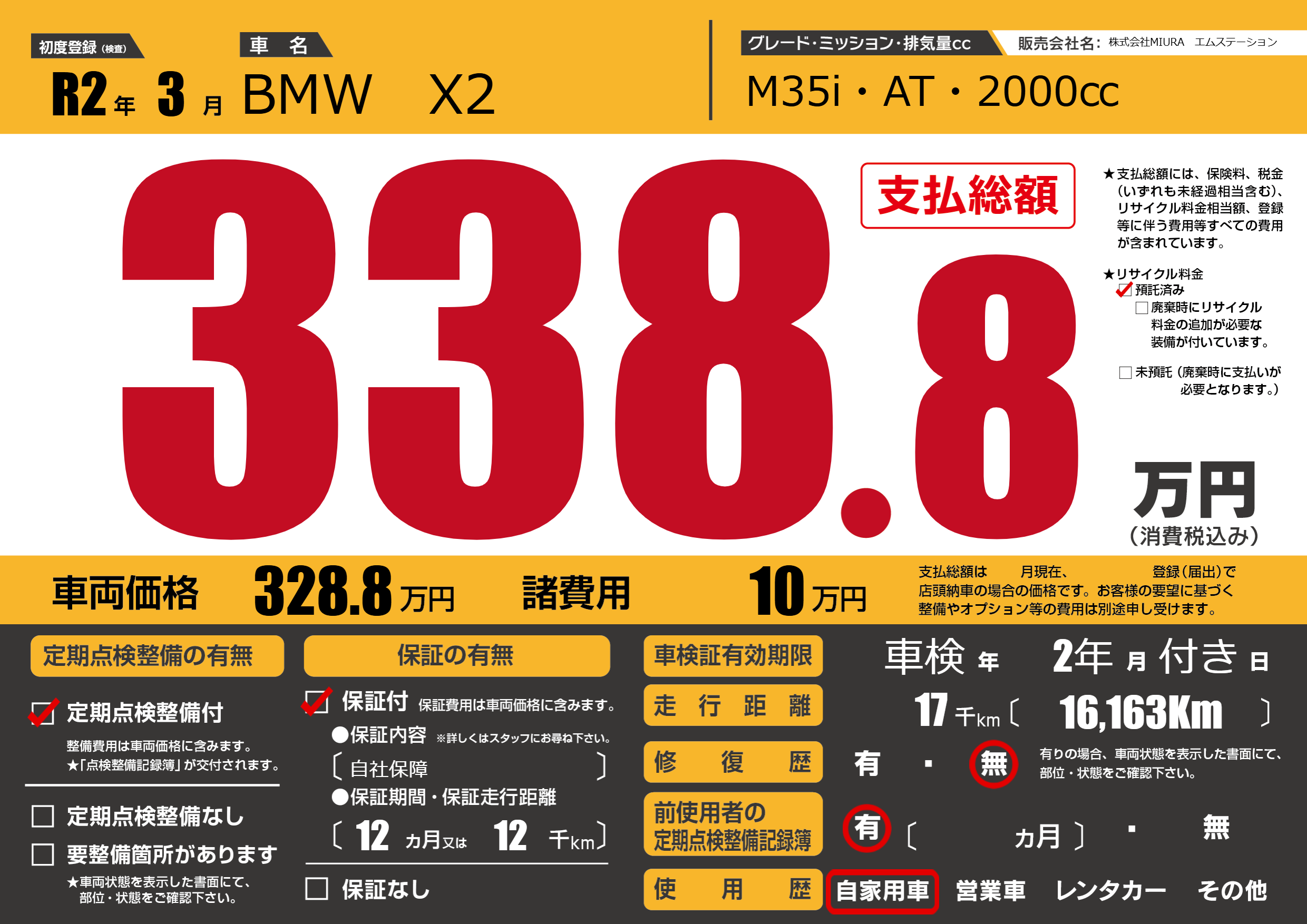 | 車名 | BMW X2 | グレード ミッション 排気量 |