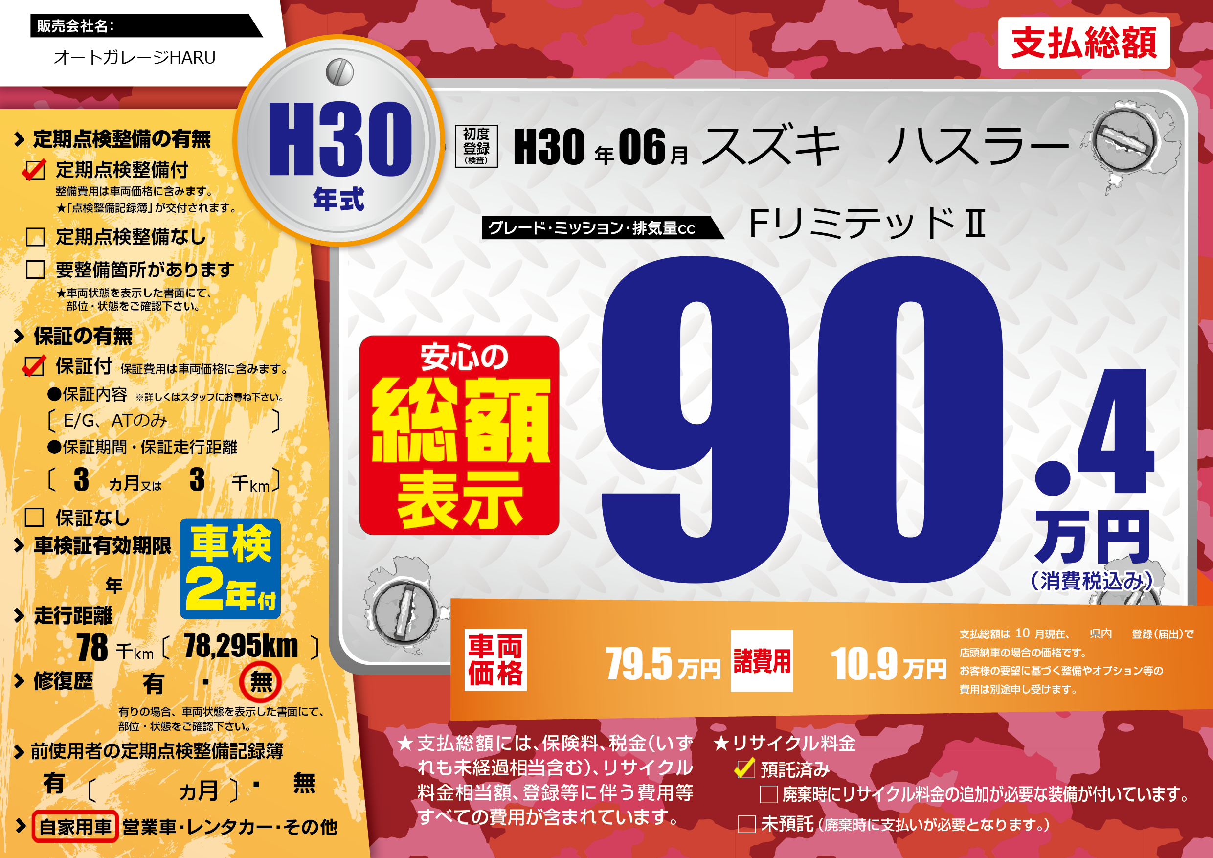 | 車名 | スズキ ハスラー | グレード ミッション 排気量 |
