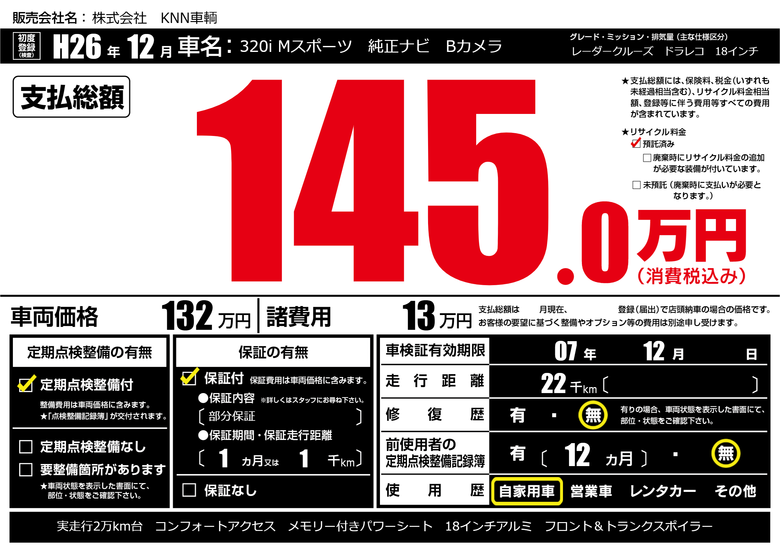 | 車名 | 320i Mスポーツ 純正ナビ Bカメラ | グレード ミッション 排気量 |