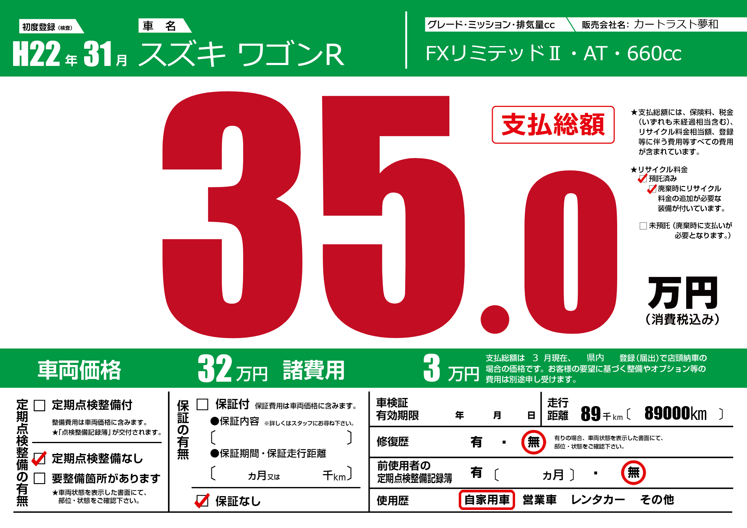 | 車名 | スズキ ワゴンR | グレード ミッション 排気量 |