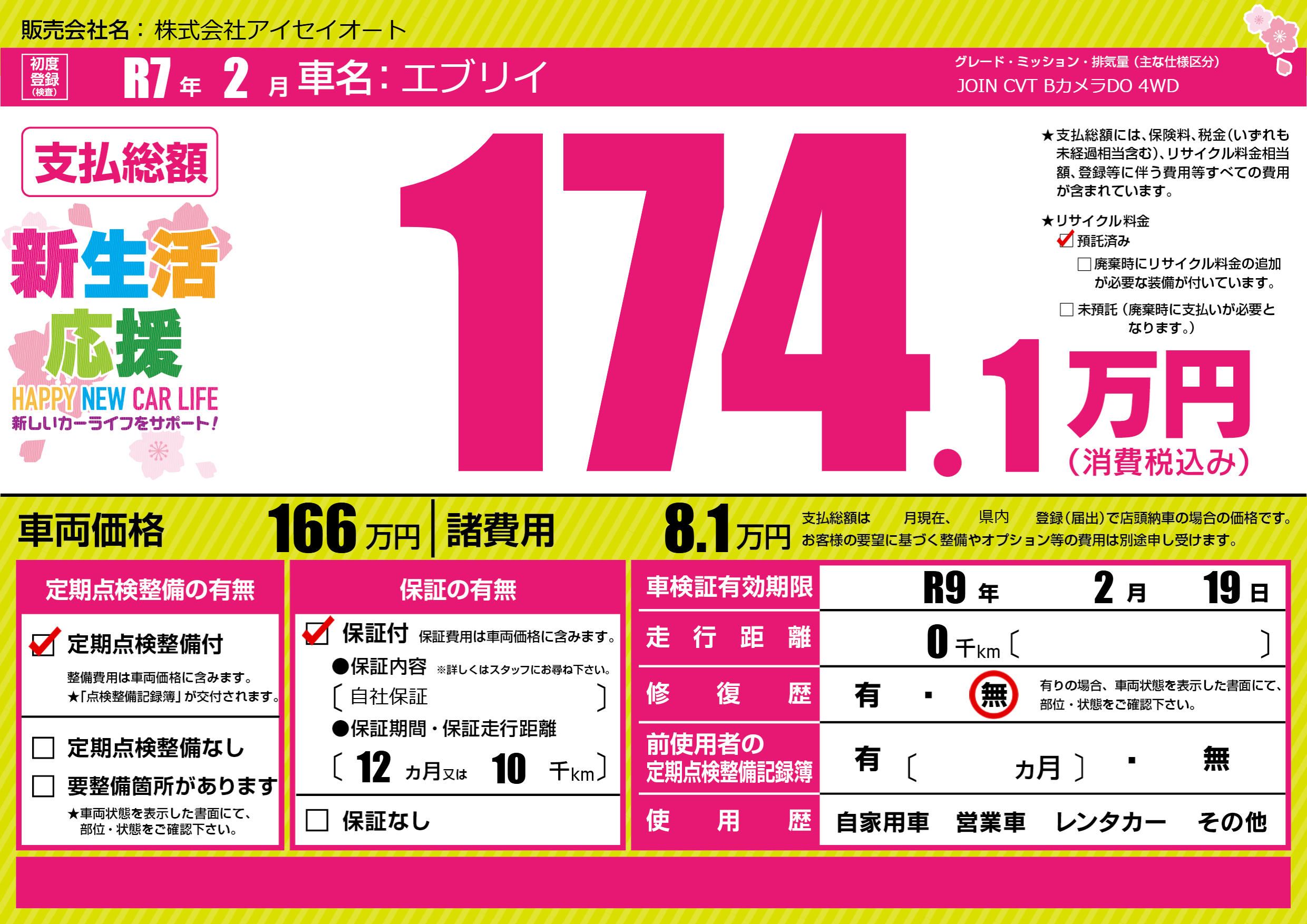 | 車名 | エブリイ | グレード ミッション 排気量 |