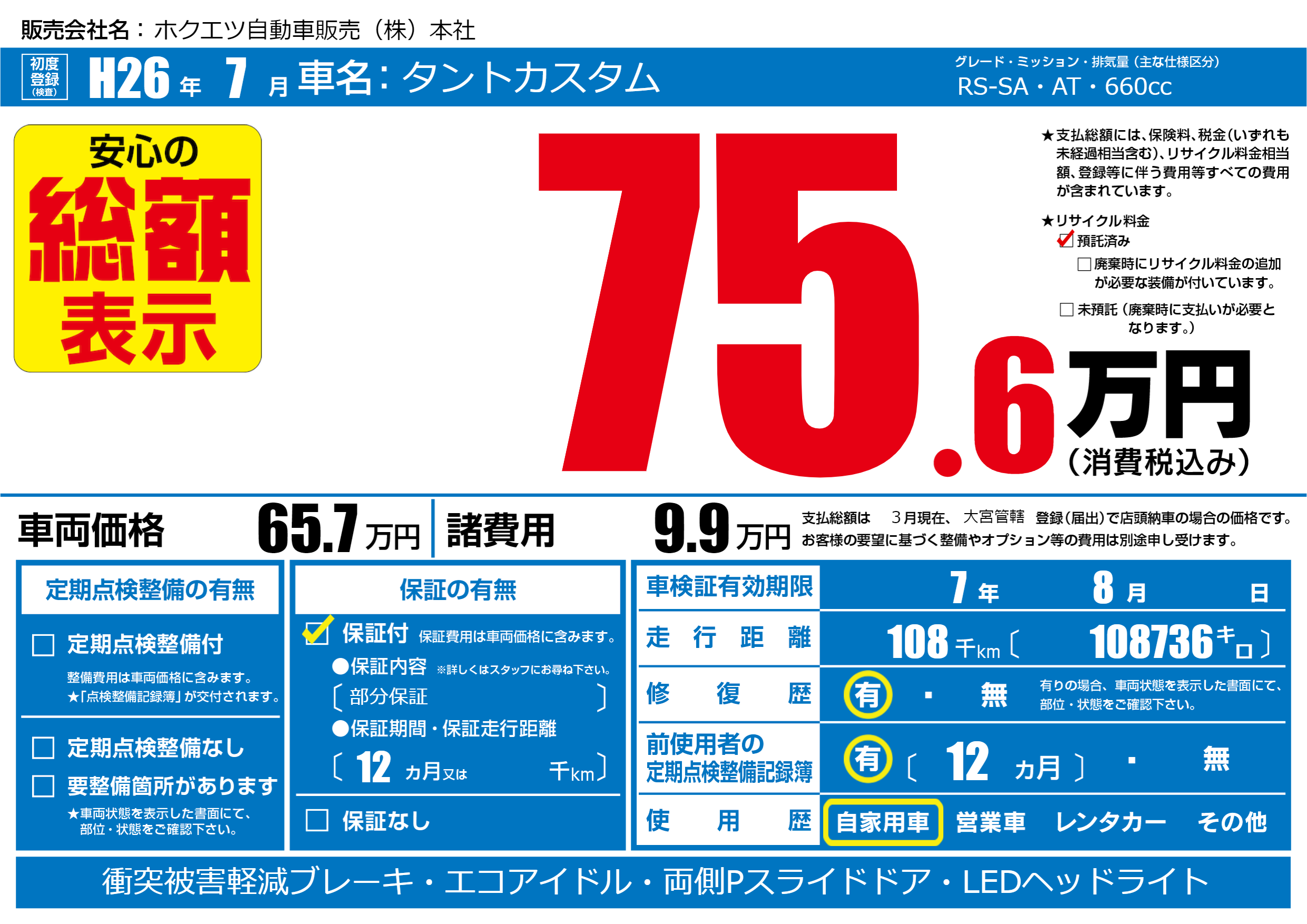 | 走行キロ | 10.8万km | 初年度登録 | H26年7月 |