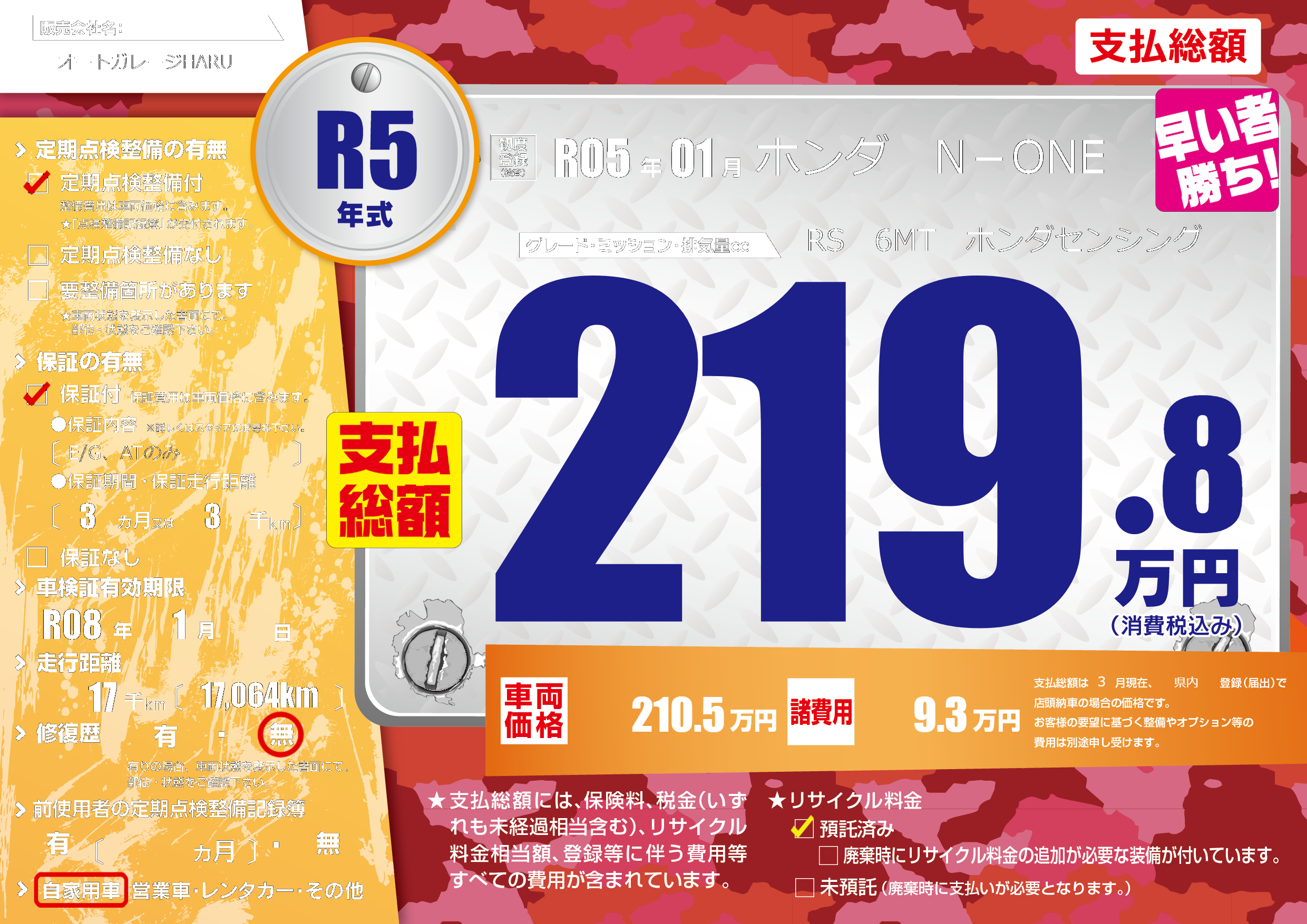 | 走行キロ | 1.7万km | 初年度登録 | R05年01月 |