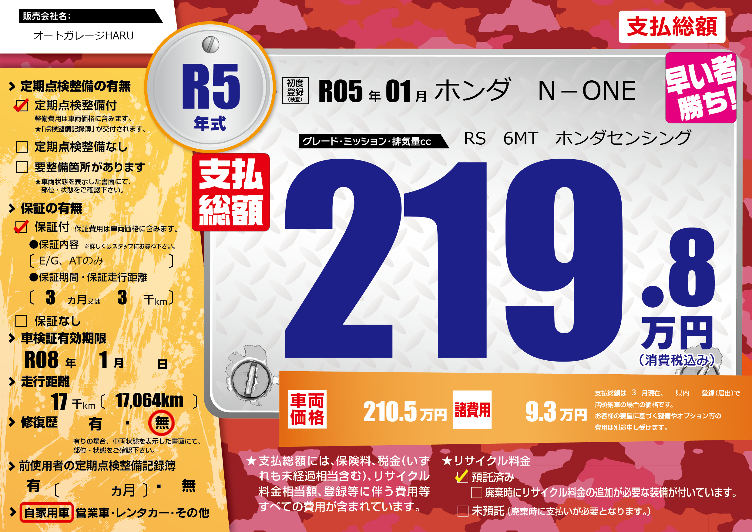 | 車名 | ホンダ N-ONE | グレード ミッション 排気量 |