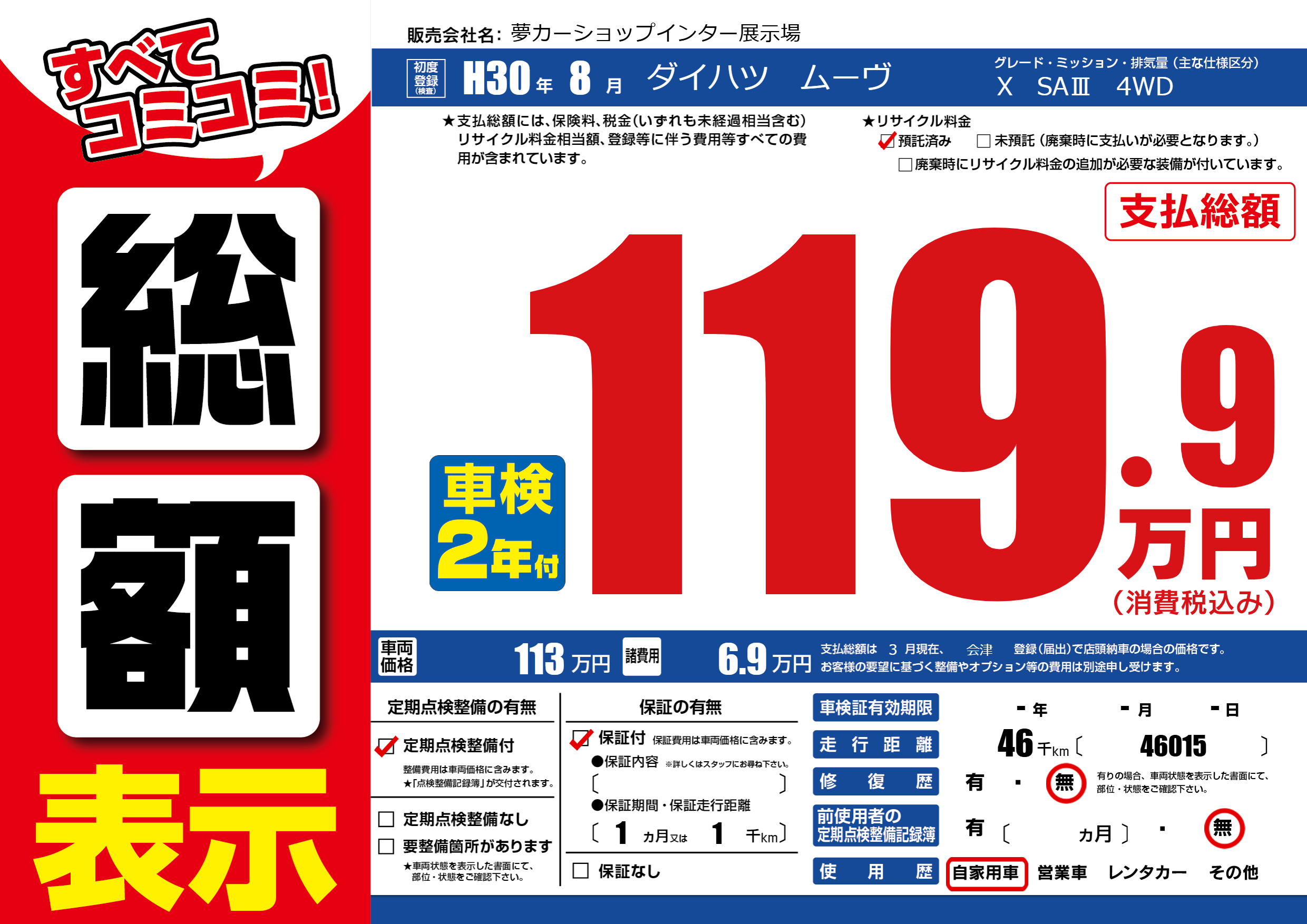 | 走行キロ | 4.6万km | 初年度登録 | H30年8月 |