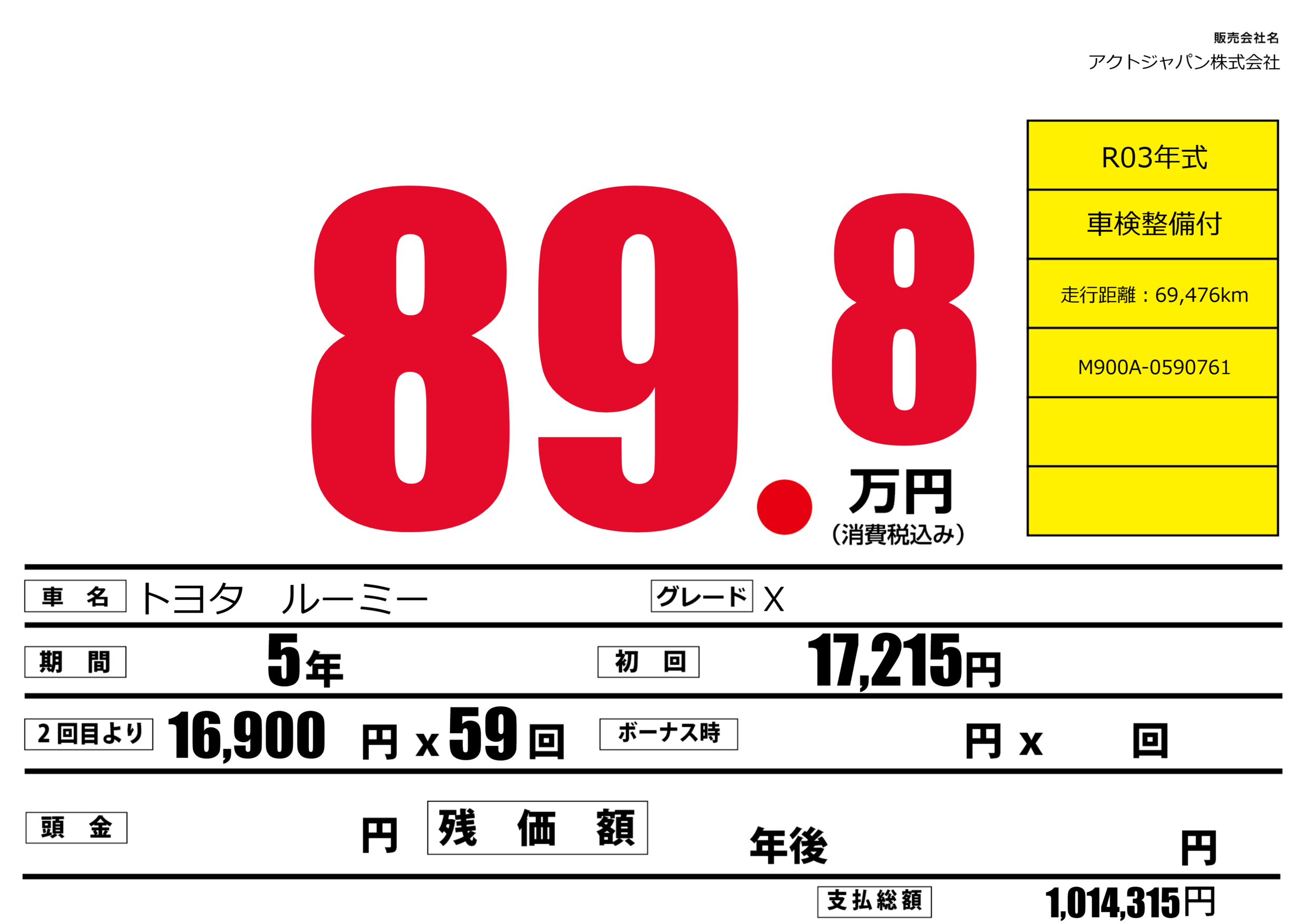 | 車名 | トヨタ ルーミー | グレード ミッション 排気量 |