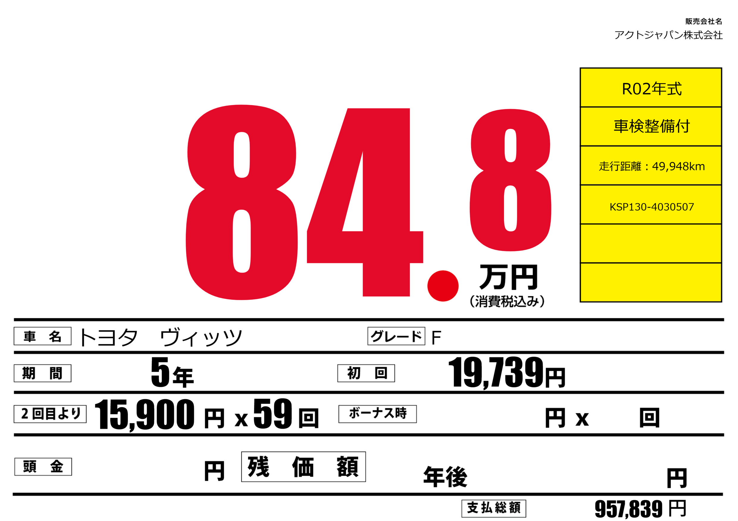 | 車名 | トヨタ ヴィッツ | グレード ミッション 排気量 |
