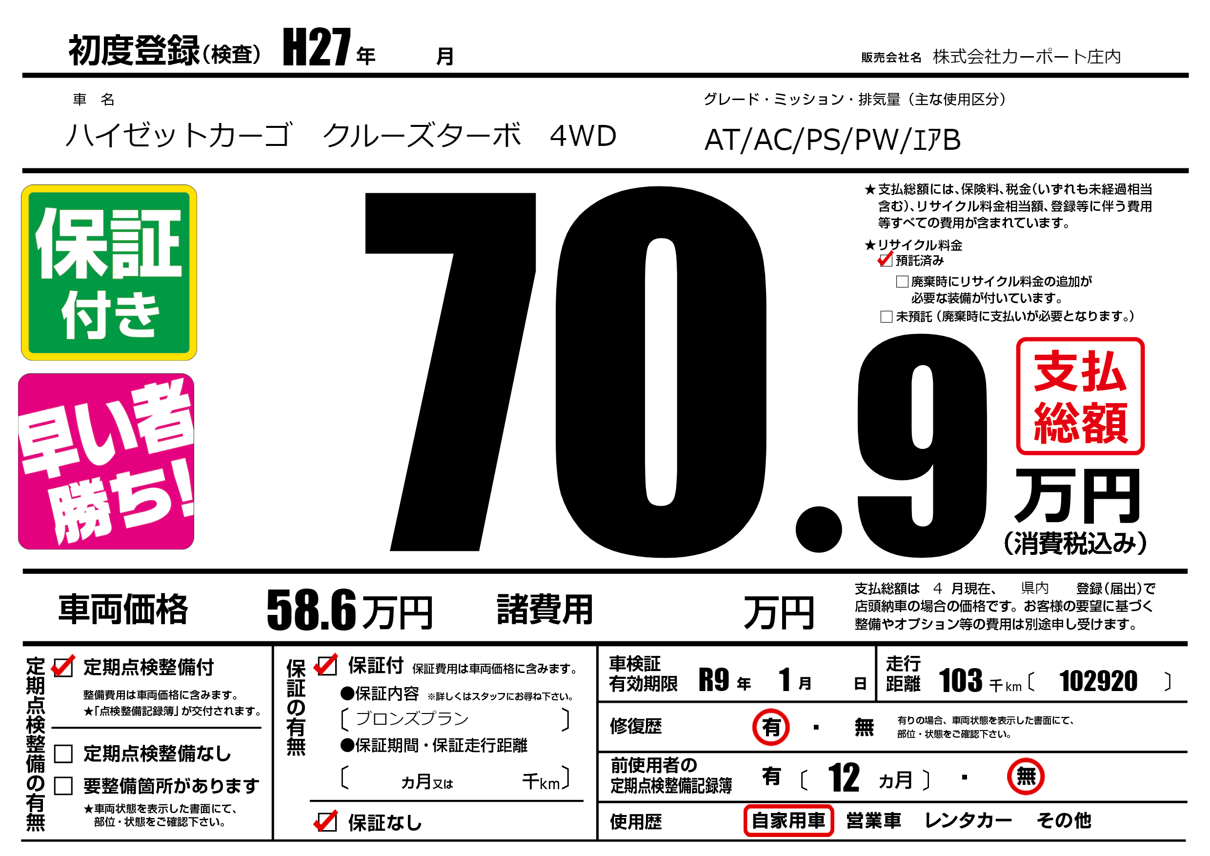 | 車名 | ハイゼットカーゴ クルーズターボ 4WD | グレード ミッション 排気量 |