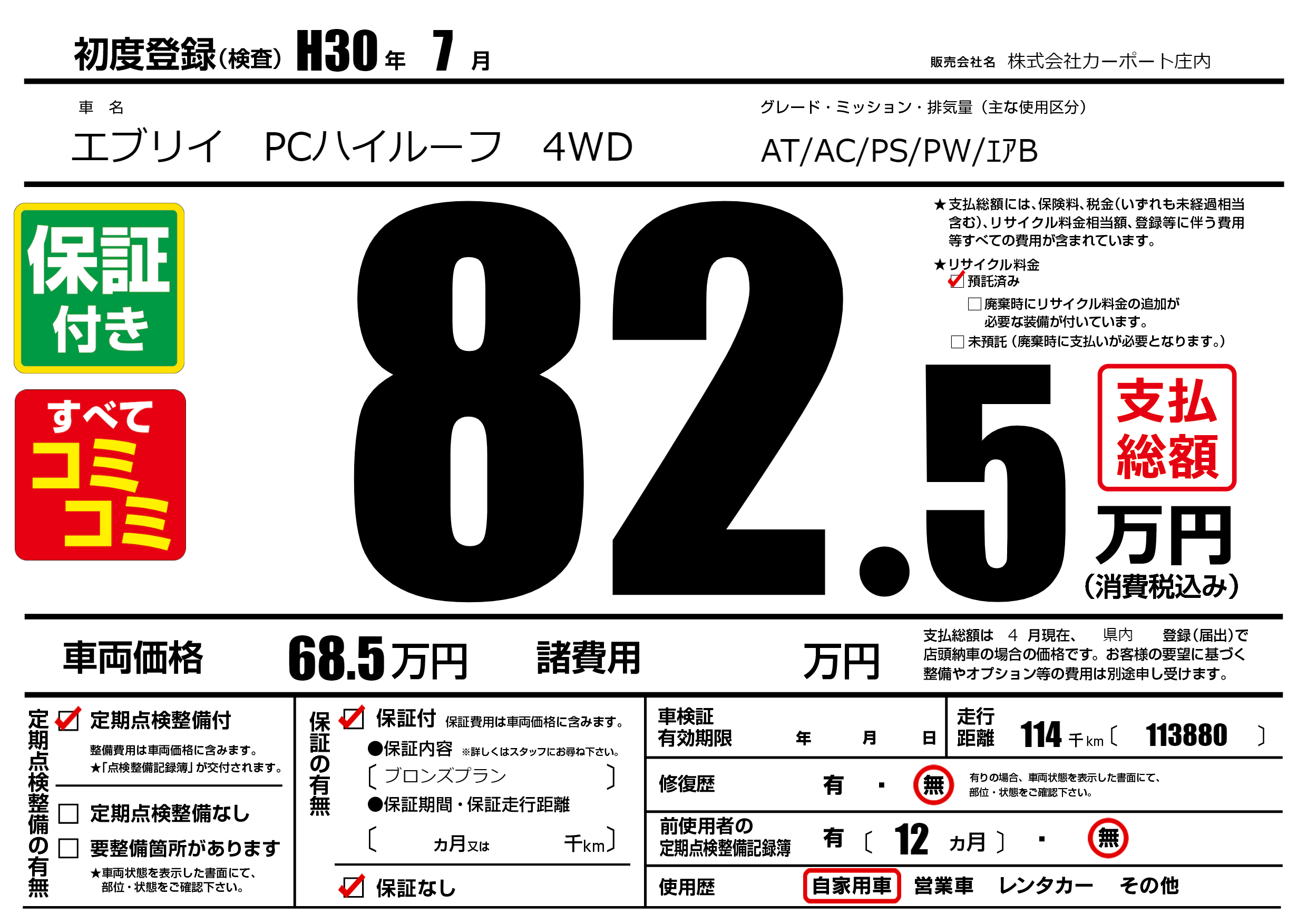| 車名 | エブリイ PCハイルーフ 4WD | グレード ミッション 排気量 |