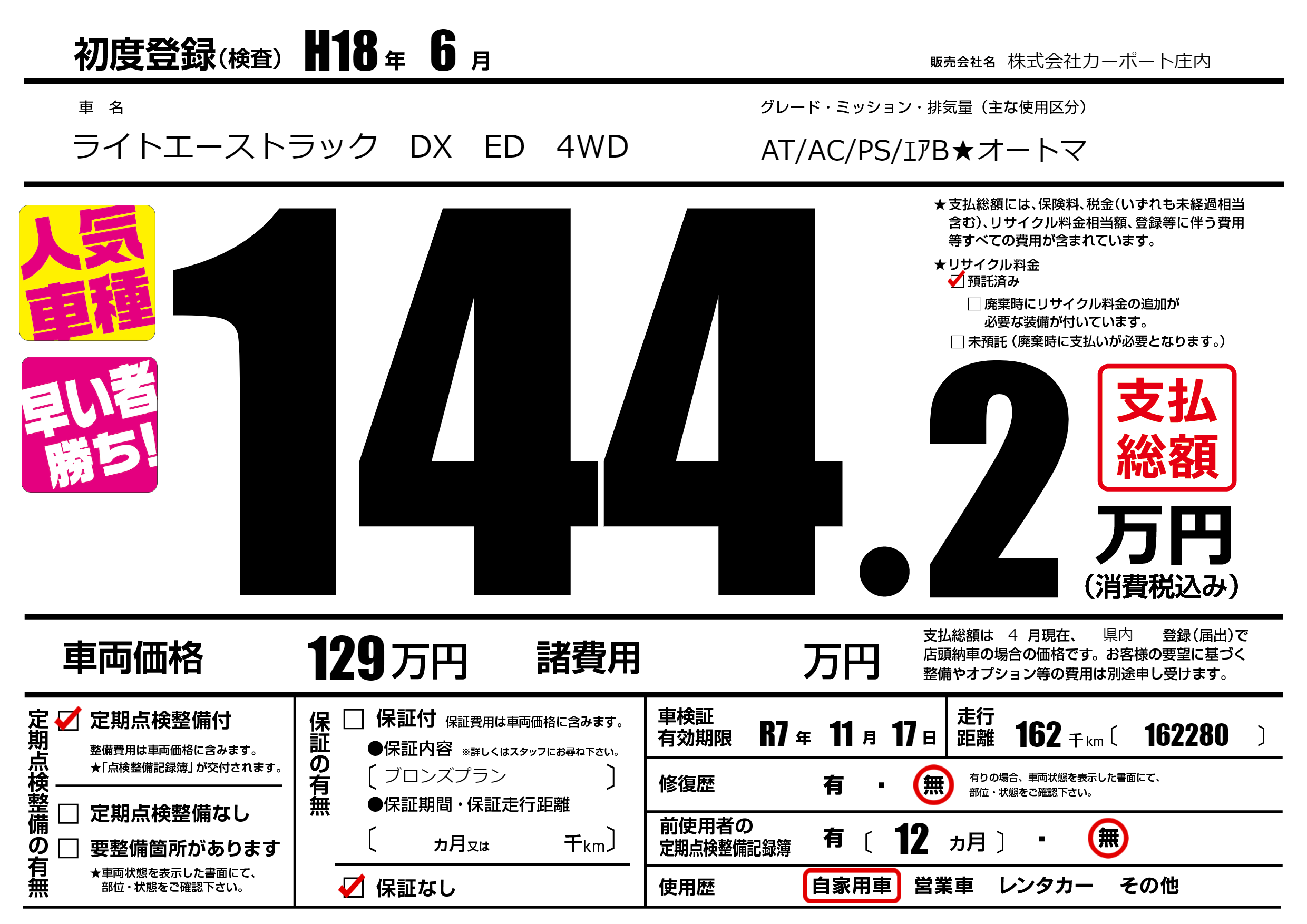 | 車名 | ライトエーストラック DX ED 4WD | グレード ミッション 排気量 |