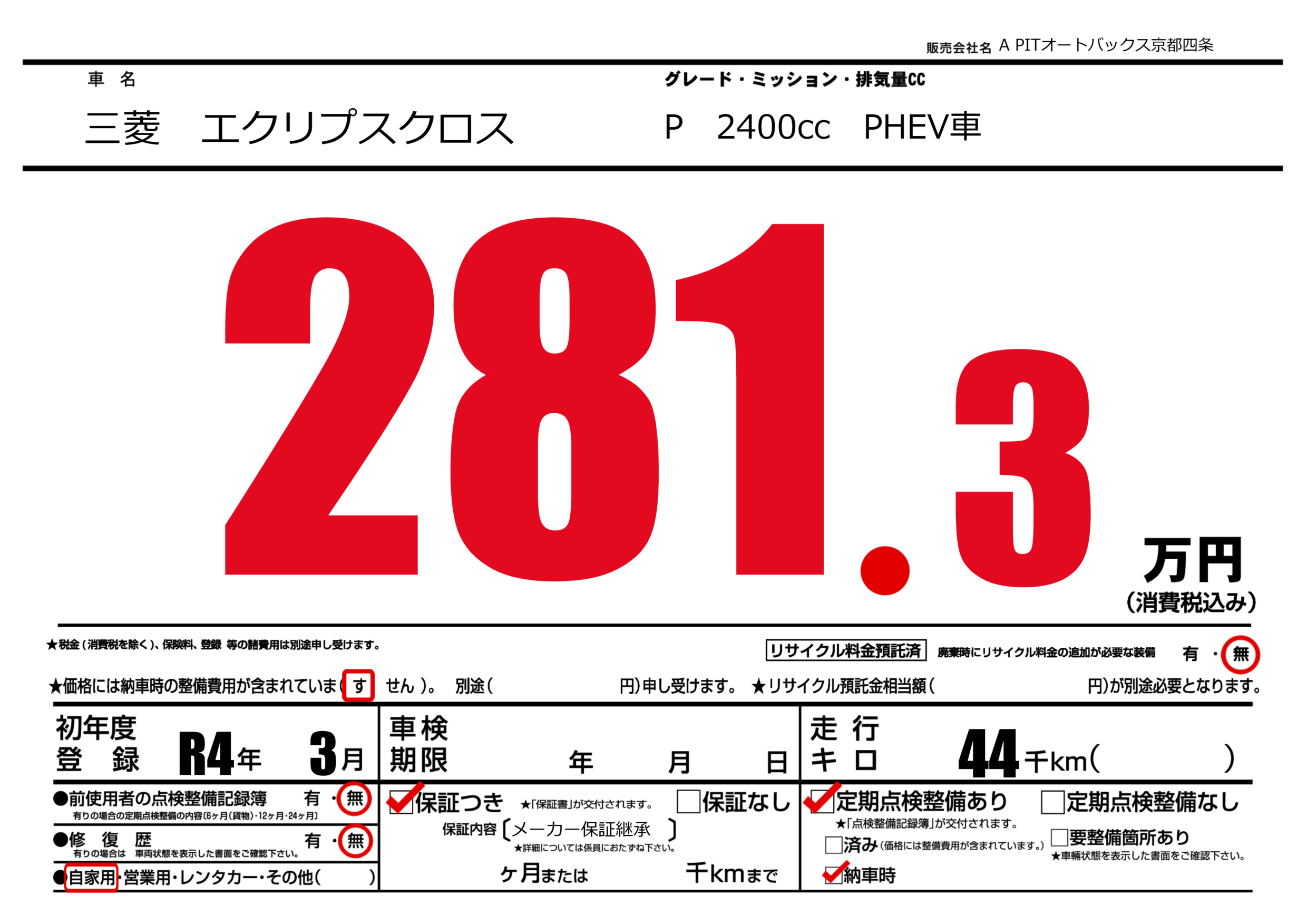 | 車名 | 三菱 エクリプスクロス | グレード ミッション 排気量 |